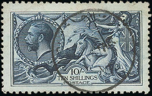 10/- indigo-blue cancelled by a neat strike of c.d.s.; a few irregular perfs. at top. S.G. 402, £475. Photo