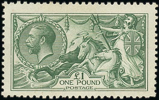 £1 green, large part original gum; light hinge mark, centred a little low. S.G. 403, £3,500. Photo