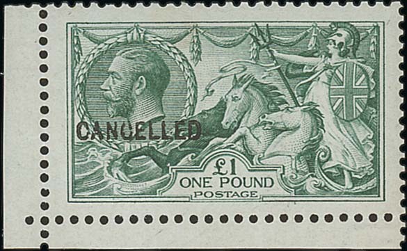£1 dull blue-green, unmounted mint from the lower left corner of the sheet overprinted