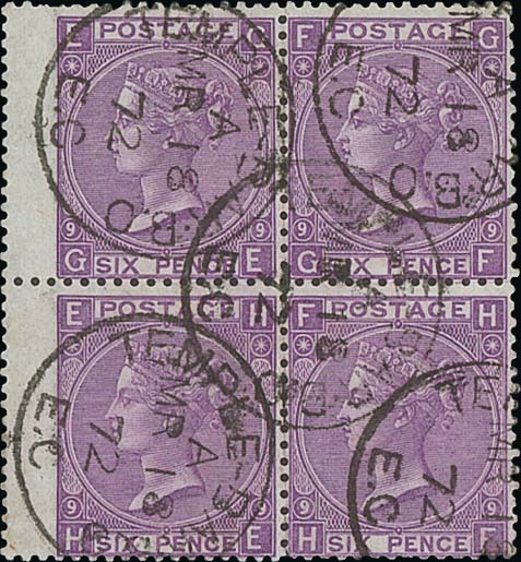 6d. mauve, plate 9, GE-HF wing margin block of four neatly cancelled by Temple Bar c.d.s. dated 1872 (18 Mar.). Cat. £575. Photo