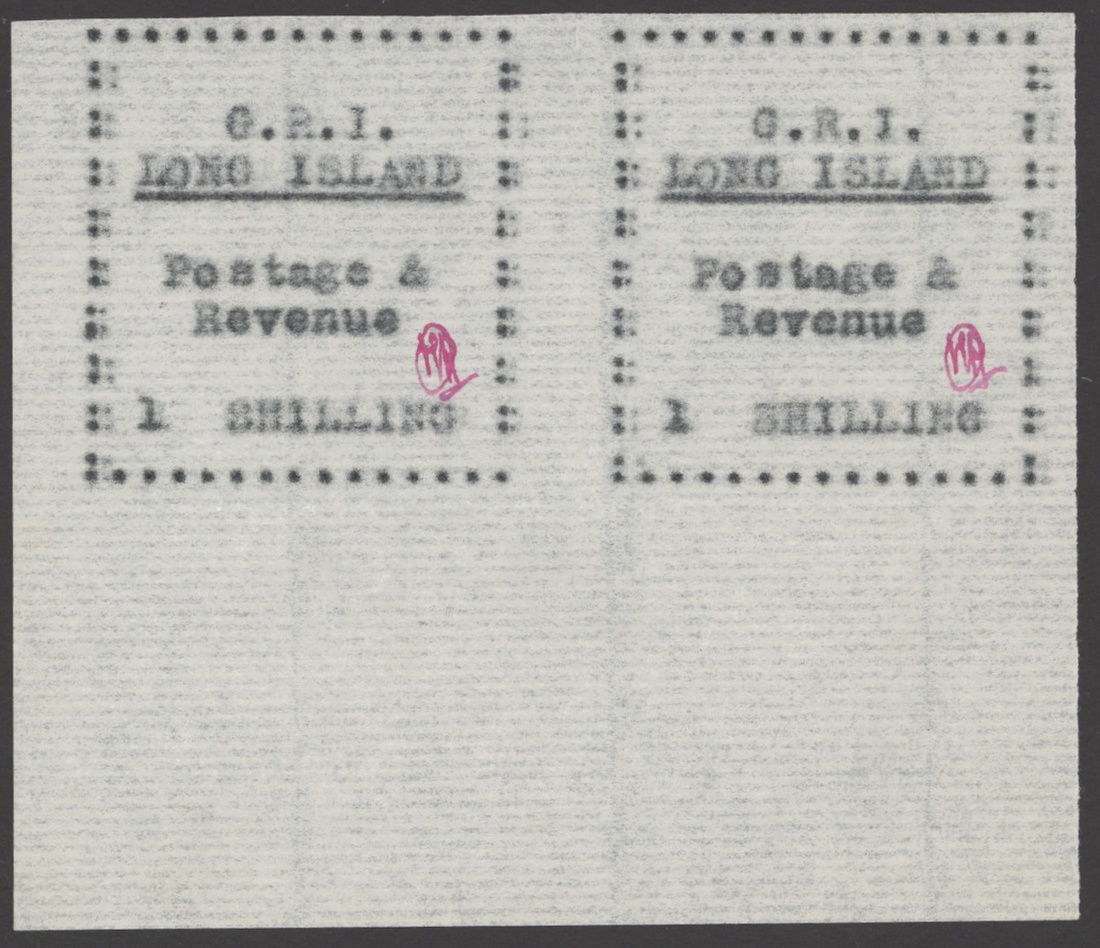 1/- black (carbon copy), horizontal pair from the foot of the sheet, the first stamp with full stop for colon at lower right; fine. S.G. 20, £650+