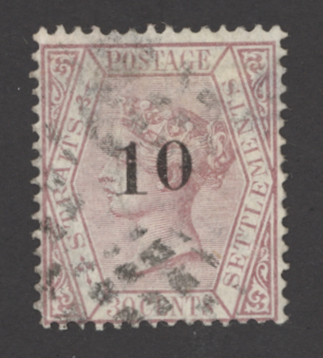 1880 (Apr.) "10" on 30c. claret, Type "g", two examples, lightly cancelled and with messy cancel respectively, both thinned at top though of good appearance. S.G. 36, £750