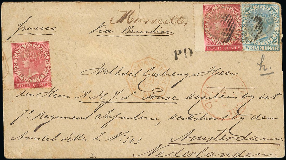 1872 (Nov.) envelope addressed to a soldier in Amsterdam, marked "Via Brindisi" (deleted) and "Marseilles", bearing 1867-72 4c. rose (2, both with wing-margin, one damaged) and 12c. blue (faults), all with firm's chop and one 4c. and the 12c. cancelled with small circle of bars, showing