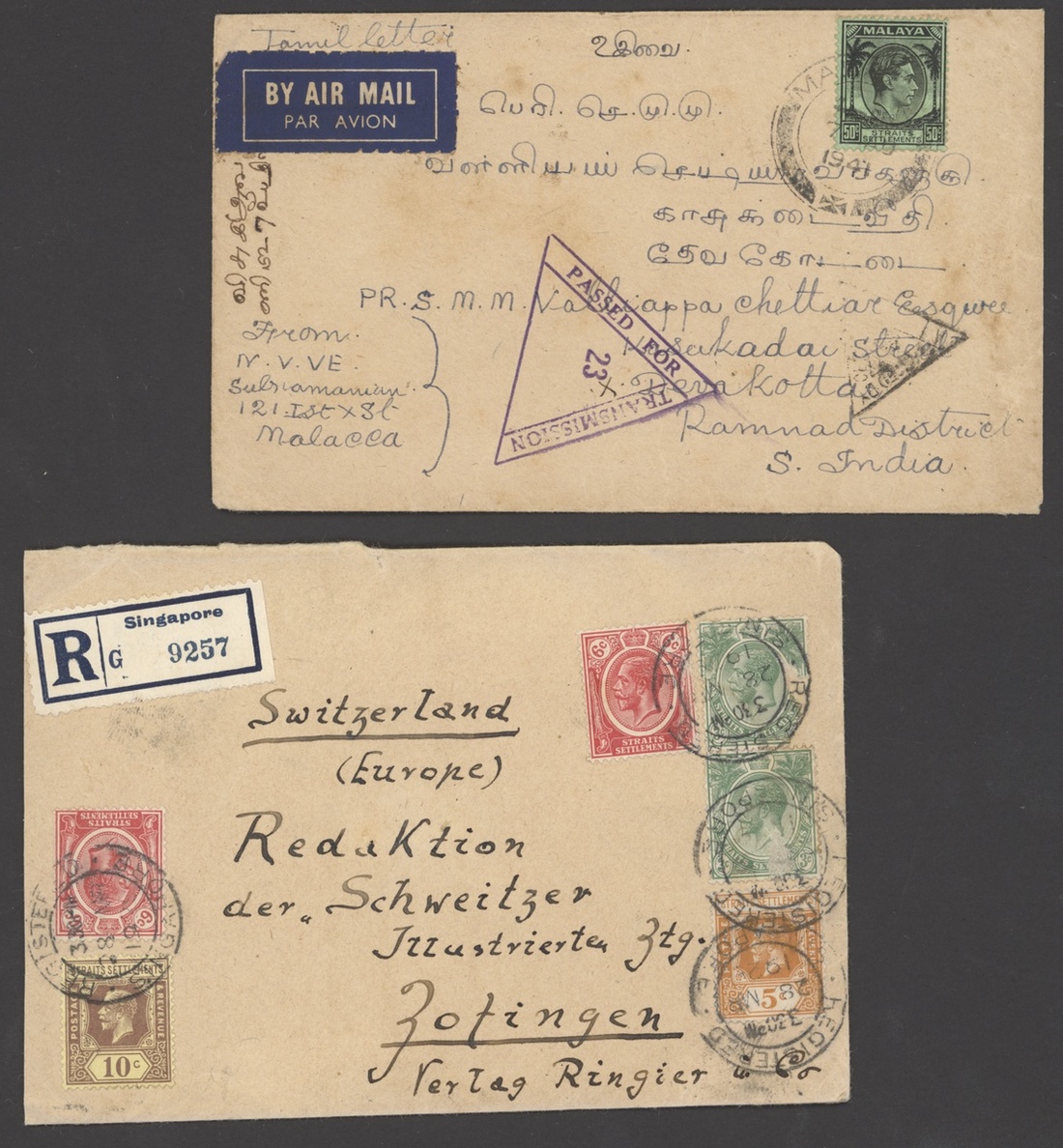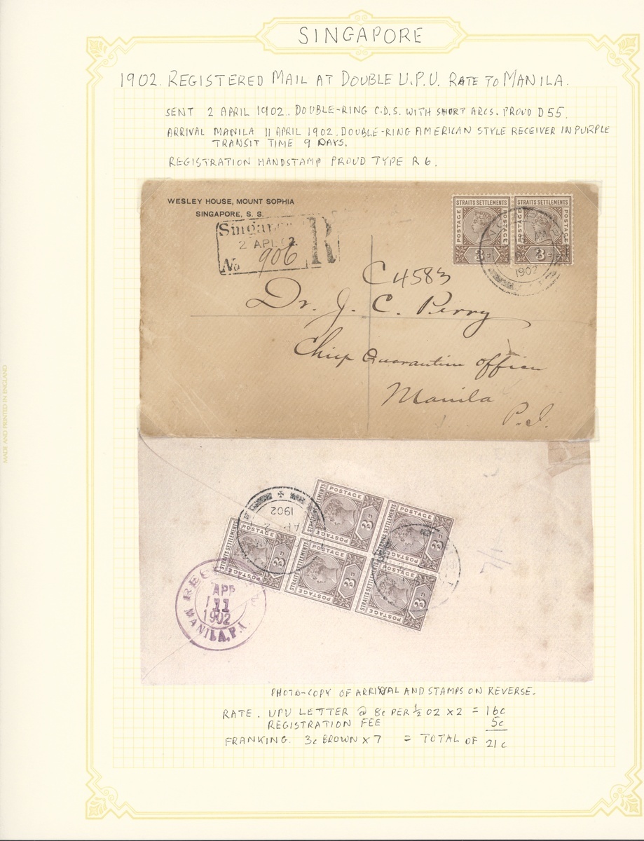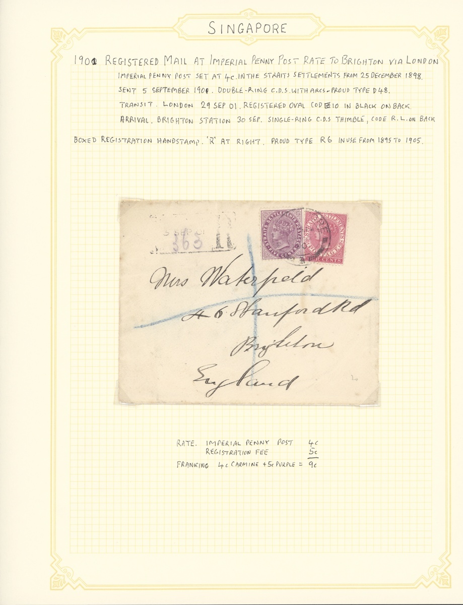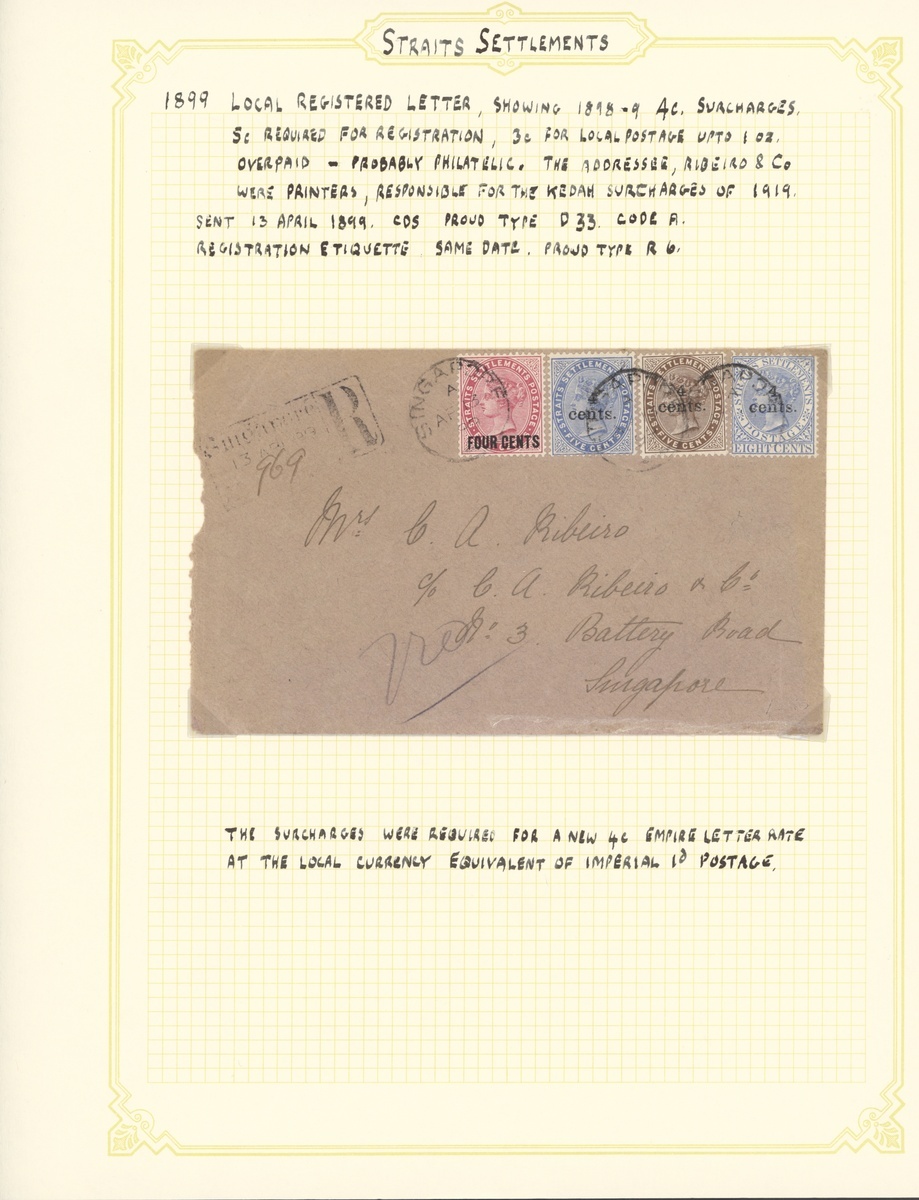 1891-1941 selection of covers sent registered (8) including 1891 envelope to India via Colombo franked at 10c., 1899 philatelic local letter, 1902 envelope to Brighton franked at 9c., 1902 envelope sent at double U.P.U. rate to Manila, 1931 (Apr.) envelopes (2), one flown registered from Singapore to Sydney, the other flown from Calcutta to Penang; also 1921-33 Script 2c. green block of forty-five from the foot of the sheet and 6c. dull claret pane of forty eight from the left hand foot of the sheet