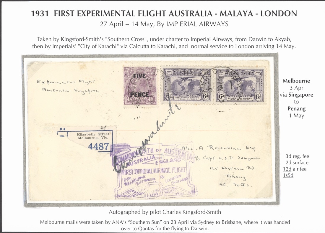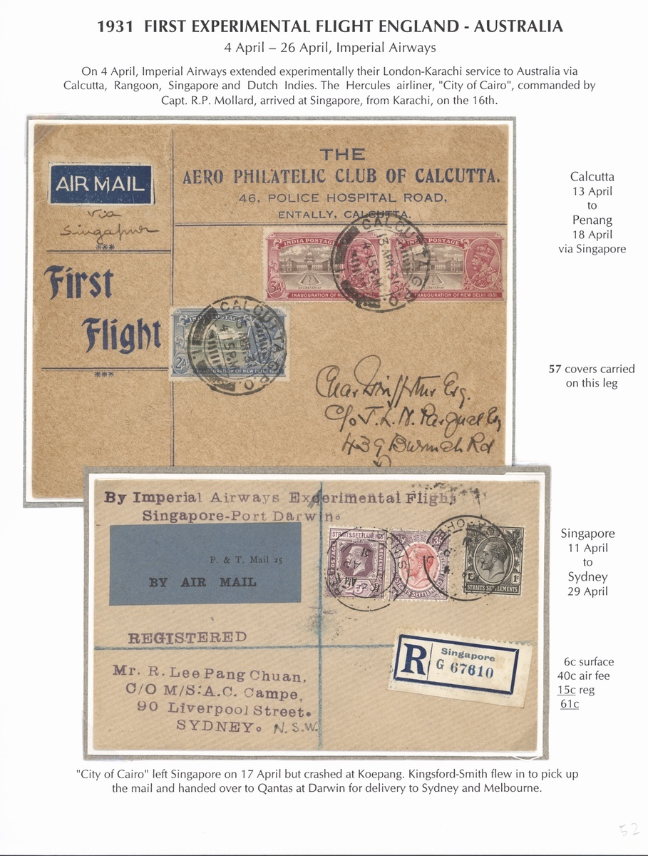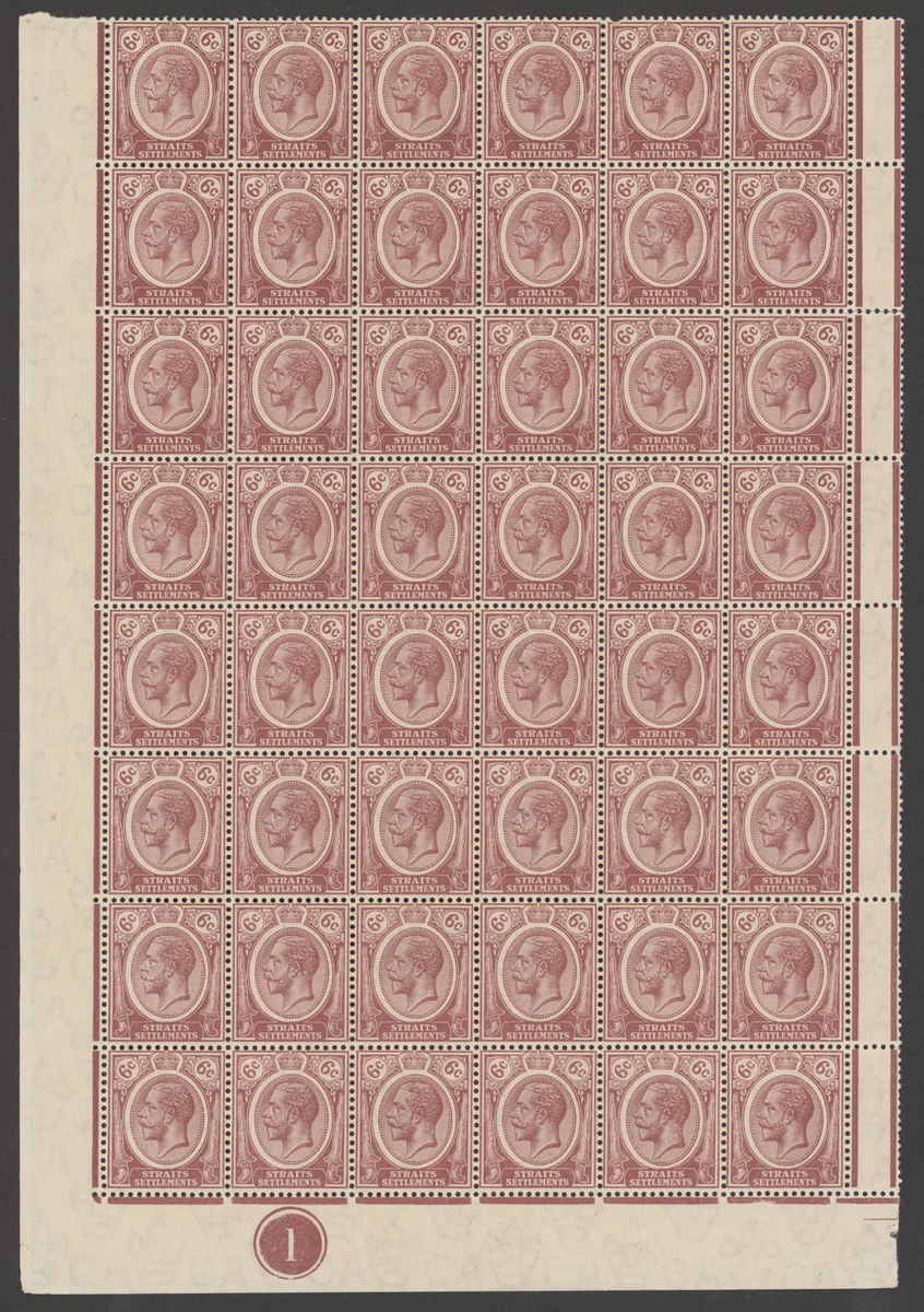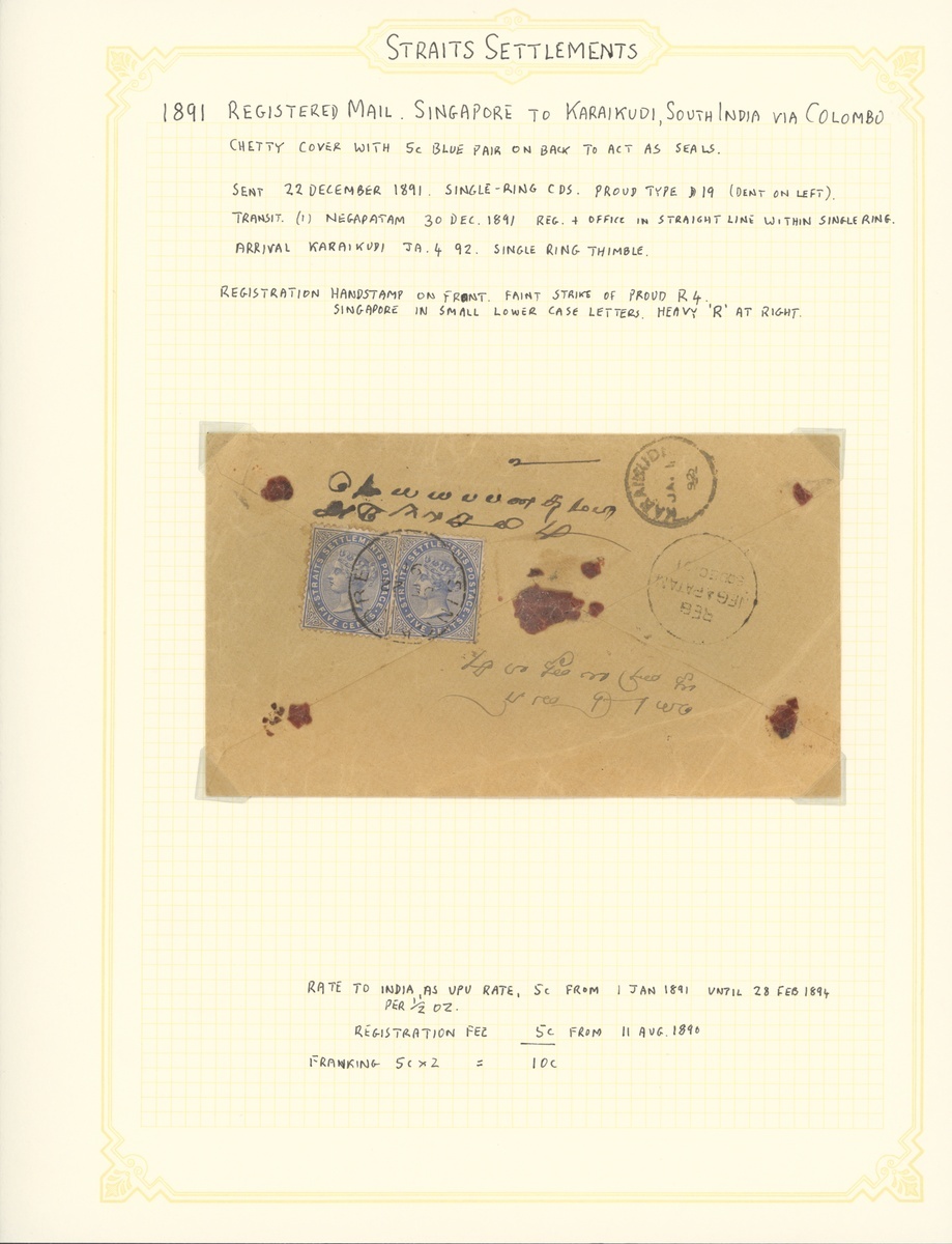 1891-1941 selection of covers sent registered (8) including 1891 envelope to India via Colombo franked at 10c., 1899 philatelic local letter, 1902 envelope to Brighton franked at 9c., 1902 envelope sent at double U.P.U. rate to Manila, 1931 (Apr.) envelopes (2), one flown registered from Singapore to Sydney, the other flown from Calcutta to Penang; also 1921-33 Script 2c. green block of forty-five from the foot of the sheet and 6c. dull claret pane of forty eight from the left hand foot of the sheet