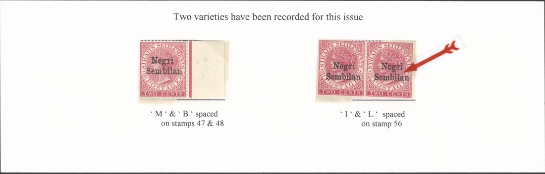 1891 2c. bright rose, an irregular block of forty-eight from the lower nine rows, showing missing "i" in "Sembilan" [17] and "m" and "b" spaced [47-48], fresh and fine mint; also a marginal single showing "m" and "b" spaced, and a pair with one showing "i" and "l" spaced. S.G. 1, £153+