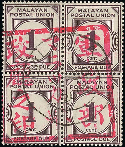 Postage Due: 1941 1c. dull purple, block of four with red chop, neatly cancelled to order, fine. B.P.A. Certificate (2006). S.G. JD11, £1,000+. Photo