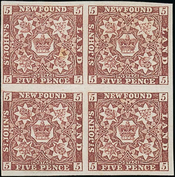 1857 5d. brown-purple block of four with part to large part original gum, good to large margins all round; wrinkle at left and one with a light mark though of fine appearance. S.G. 5, £1,400+. Photo