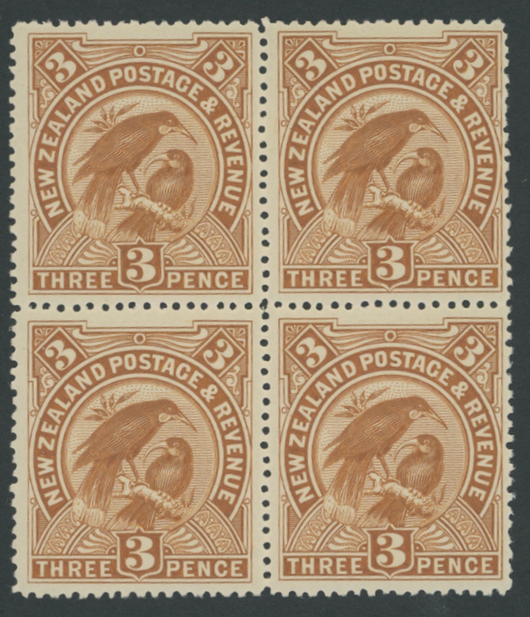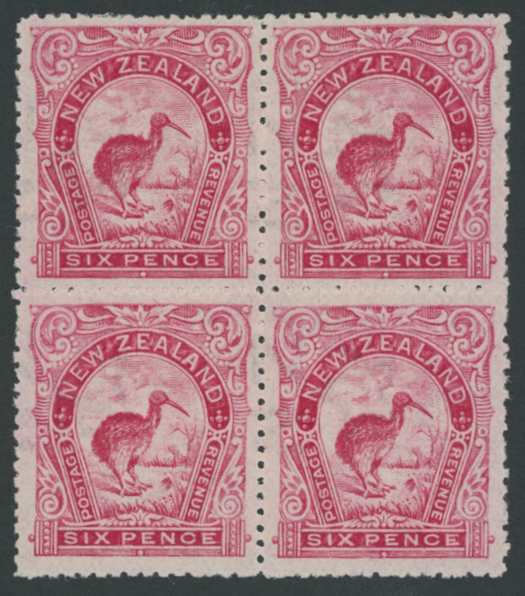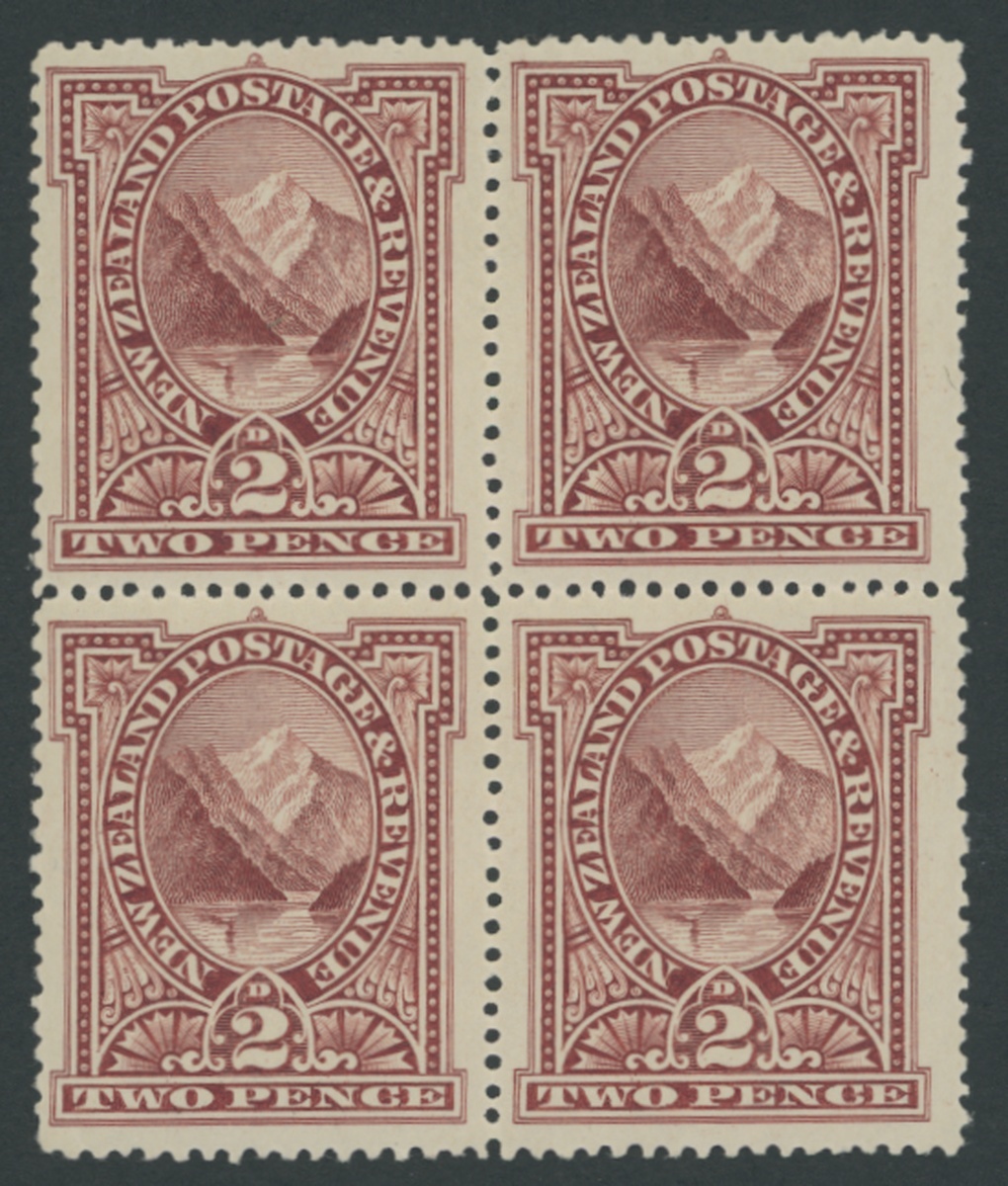 1898 Pictorial, Waterlow printing 2d. rosy lake block of four, unused with large part original gum, 3d. yellow-brown block of four, unmounted mint, and 1902-09 perf 14 6d. bright carmine-pink block of four, unused with large part original gum; fine. S.G. 248b, 251, 324, £500