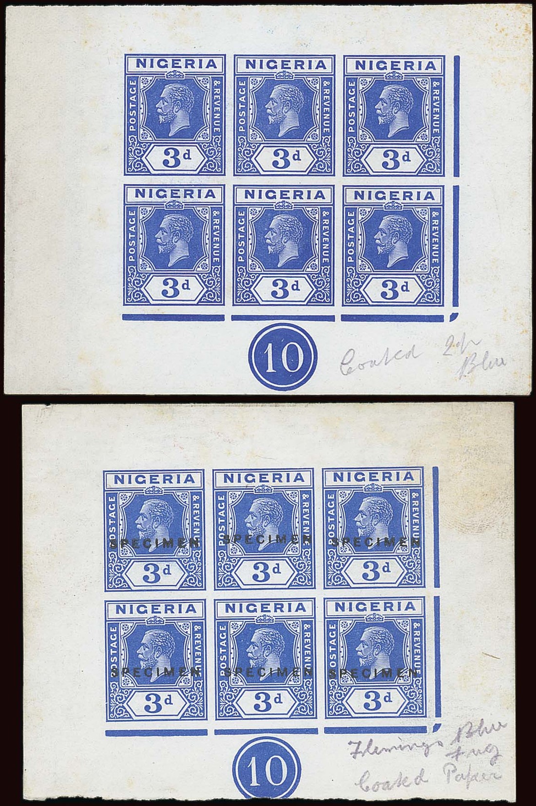 1922 (c.) 3d. Die II, a group of four matching proof sheetlets of six (3x2) in shades of ultramarine, printed from a special miniature plate showing Jubilee lines at right and at foot with plate number "10" centred at foot, each imperforate on gummed unwatermarked wove paper, two being on unsurfaced paper and two on chalk-surfaced paper with one of each paper type overprinted "