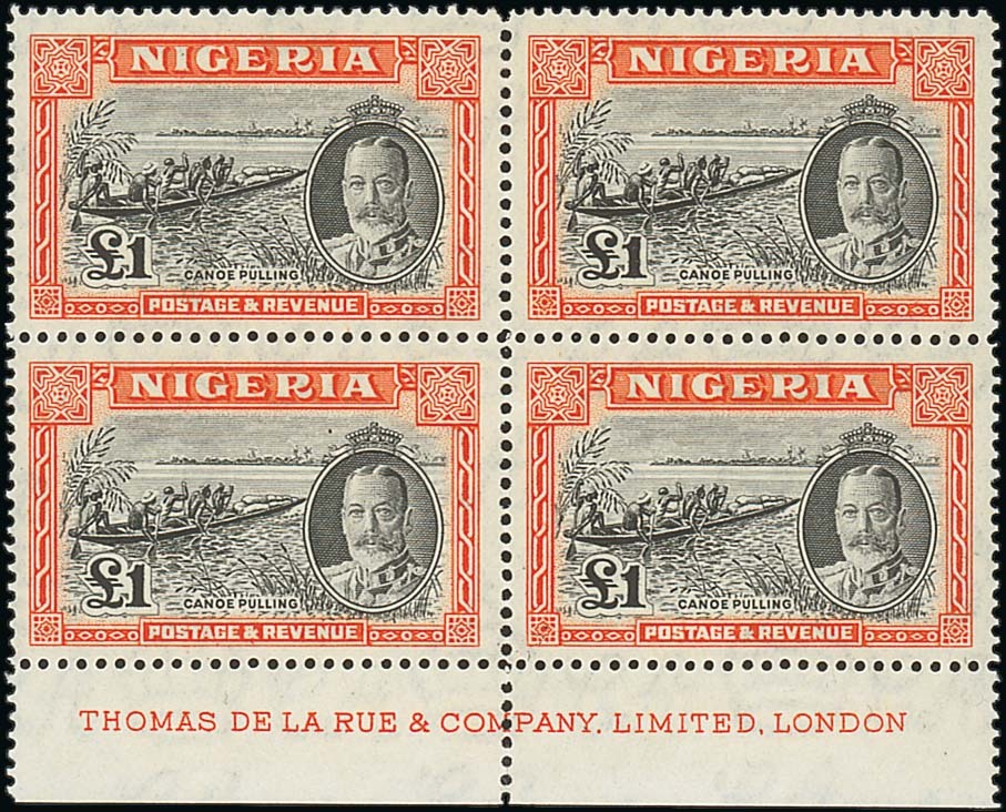 £1 black and orange marginal block of four with full De La Rue imprint; also ½d., 1d., 1½d., 2d. and 3d. marginal or corner blocks of four. S.G. 45, £520+. Photo