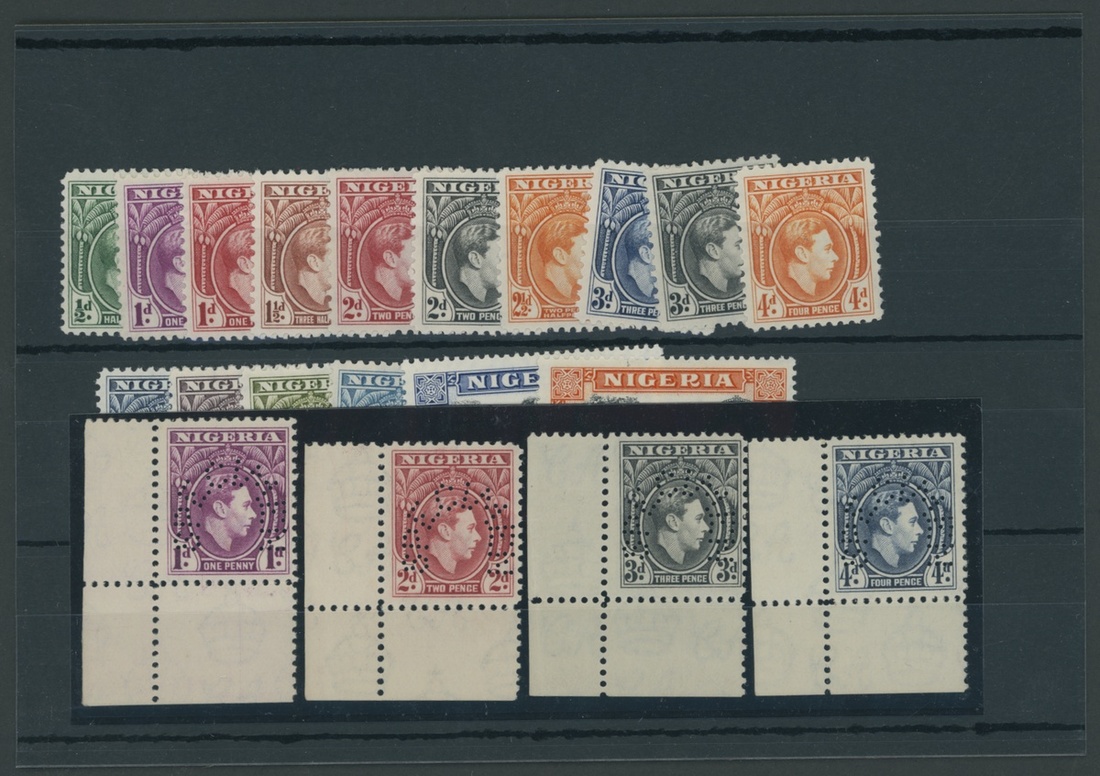 ½d. to 5/- set of sixteen and offered with 1944 second colours 1d. carmine, 2d. rose-red, 3d. black and 4d. blue, all four from the lower left corner of the sheet and perforated "