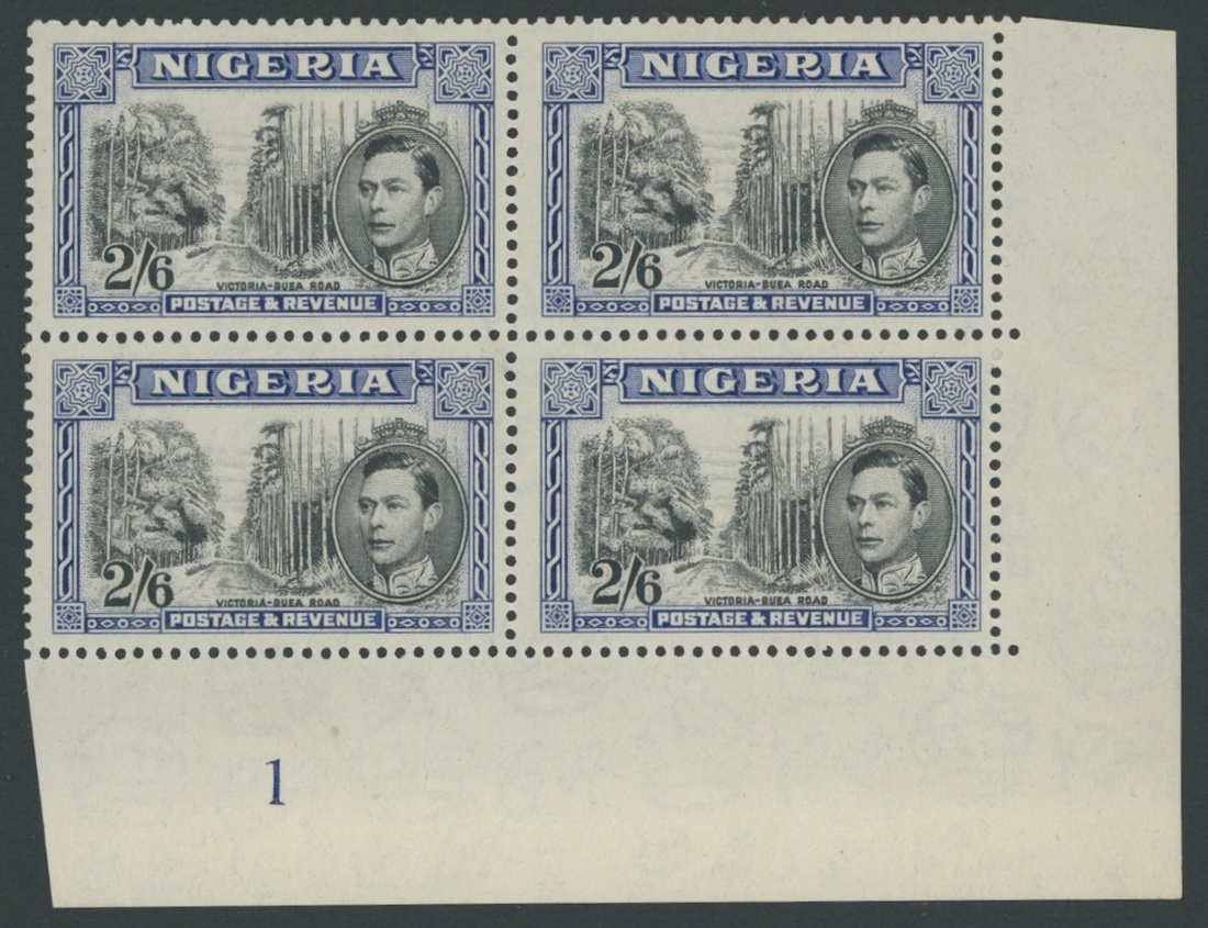 2/6d. black and deep blue perf. 13½ lower right corner plate "1" block of four, fresh mint with only one stamp mounted. S.G. 58ab