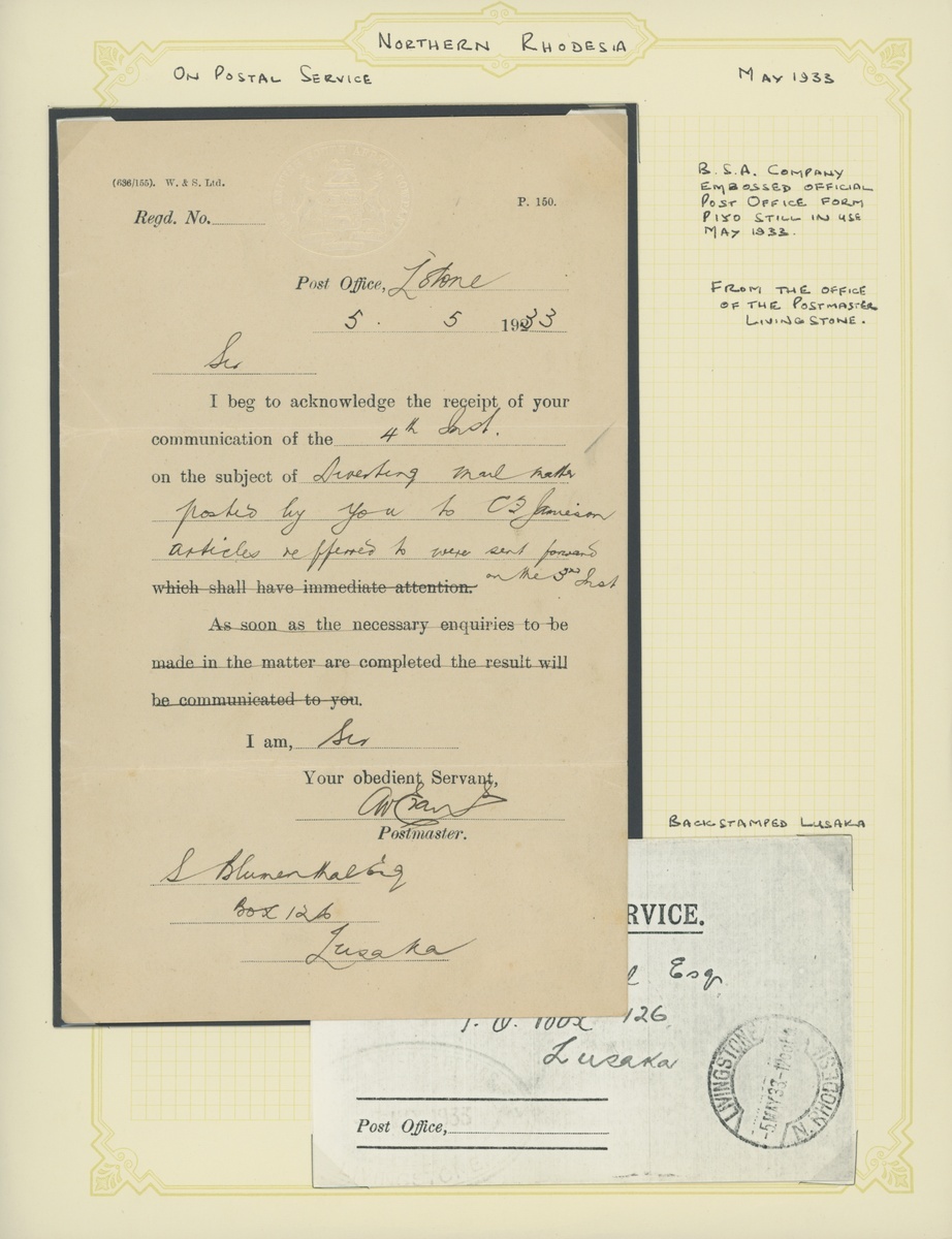 1933 B.S.A.C. On Postal Service embossed official post office form P/150 wrapper from the office of the Postmaster at Livingstone to Lusaka on the matter of diverting mail to the recipient