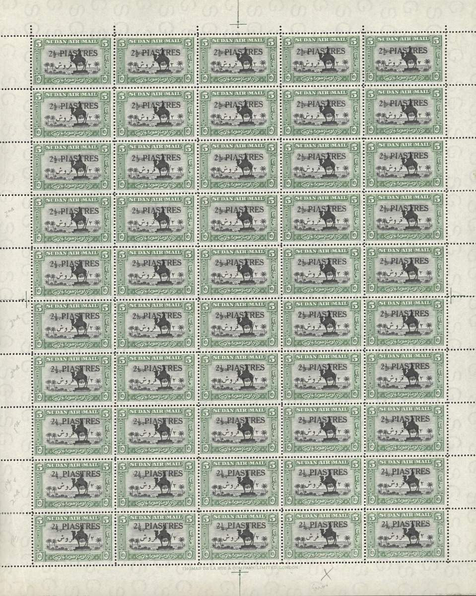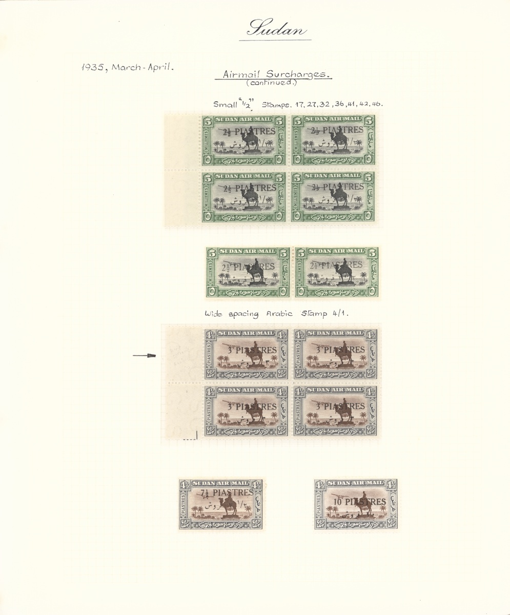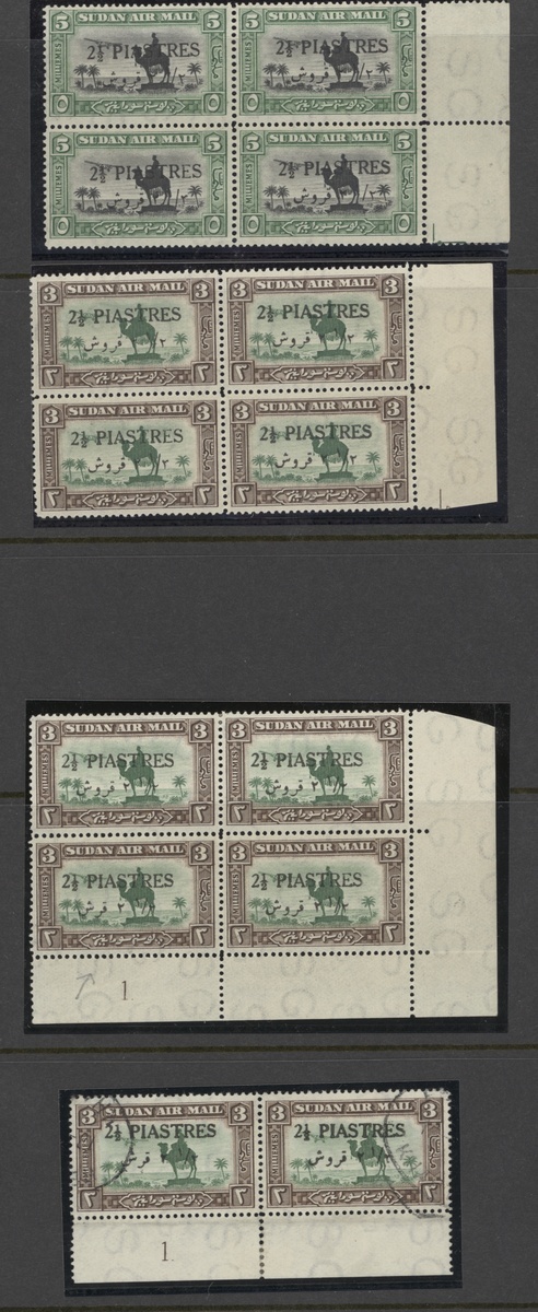 A mint collection (98) including 2½p. on 3m. mint plate block of four and a used pair, both with one showing second Arabic letter missing from surcharge, 2½p. on 3m. and 2½p. on 5m. imprint strips from the foot of the sheet, both showing small "½" and second Arabic letter missing from surcharge, 2½p. on 5m. complete sheet with small "½" and second Arabic letter missing from surcharge, 2½p. on 5m. vertical pair with surcharge grossly misplaced and 3p. on 4½p. marginal block of four with one widely spaced Arabic surcharge; generally fine