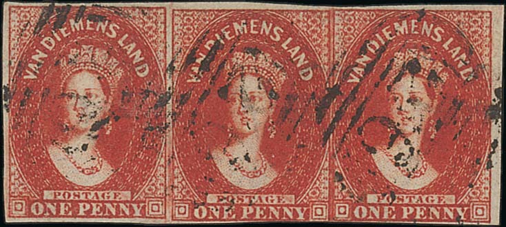 1855 wmk. Large Star 1d. carmine horizontal strip of three with mainly good to large margins (centre stamp just cut-into at foot), lightly cancelled "29" at Evandale, fine. R.P.S. Certificate (1991). S.G. 14. Photo