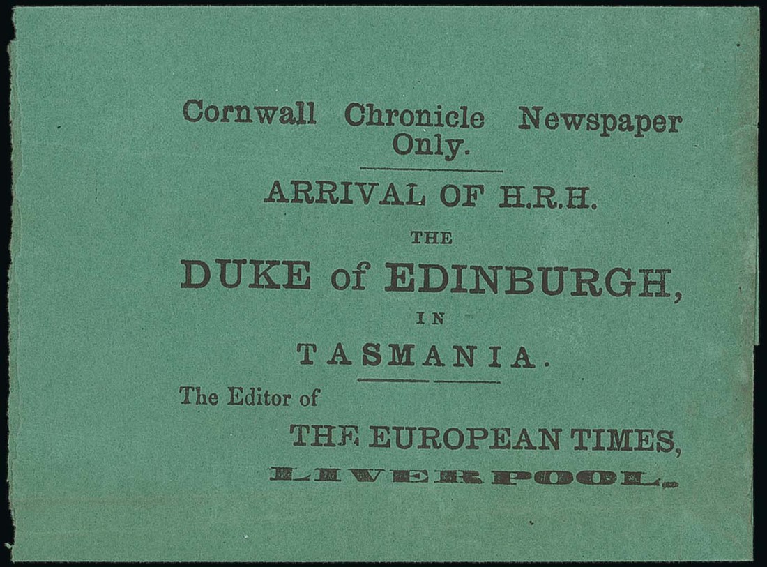 1868 "Cornwall Chronicle Newspaper" of Launceston, Tasmania newspaper wrapper, especially printed for use on the newspaper commemorating the 1868 Royal Visit of the Duke of Edinburgh, printed on dark green paper as The Duke of Edinburgh's official livery colour is dark green, known as "Edinburgh Green". Very fine unused and the only recorded example surviving. A significant piece of "Royal" postal history being the earliest newspaper wrapper produced in Tasmania and the only wrapper produced to commemorate a significant event such as a Royal Visit. A copy of an article concerning the Royal Visit to Tasmania accompanies the lot. An exhibition showpiece. Photo