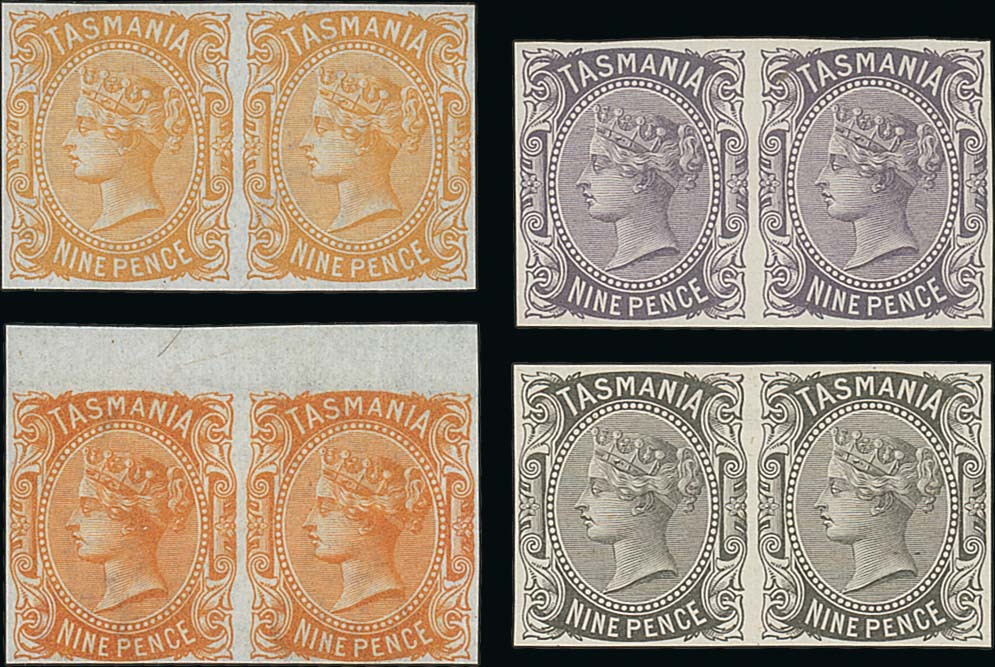 Note: As the colour of the 9d. stamp was not specified by Tasmania, De La Rue printed five sheets of the 9d. in different colours and despatched the sheets to Tasmania with the 9d. plate in 1871. The trials were the only English use of the plate.