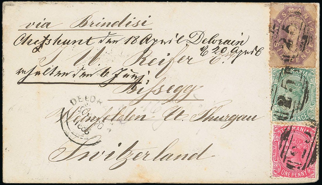 1883 (20 Apr.) envelope from Deloraine "via Brindisi" to Switzerland, bearing perforated Chalon 6d. and Sideface 1d. and 2d. each cancelled "25", showing despatch c.d.s. at left and, on reverse, Launceston and Swiss railway TPO. A very rare origin-destination cover and desirable three colour mixed-issue franking. Pre-UPU mail from Tasmania to foreign destinations is scarce. Photo
