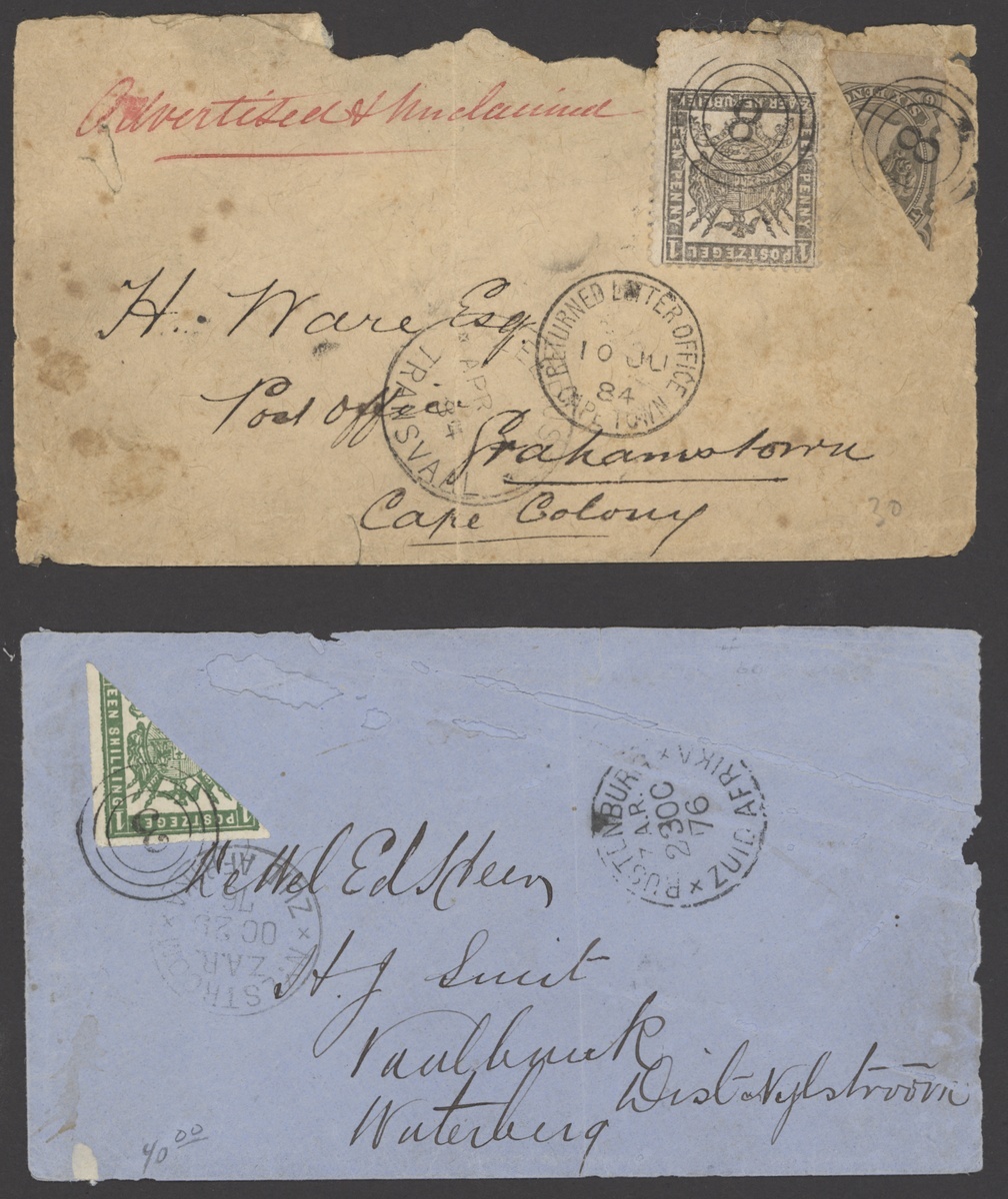 1876 (23 Oct.) envelope from Rustenburg to Waterberg, bearing 1/- green bisected diagonally and neatly cancelled and tied on the non-bisect side by numeral "3", despatch and Nylstroom datestamps on face, and 1884 (Apr.) envelope from Zeerust to Grahamstown Post Office bearing 1878 6d. bisected diagonally and in combination with 1883 1d. grey, both neatly cancelled "8" and with despatch and Cape Town Returned Letter Office datestamps at foot, marked "Advertised & Unclaimed" at top; both with faults/defects though a most unusual pair with the latter bisect not listed in S.G.