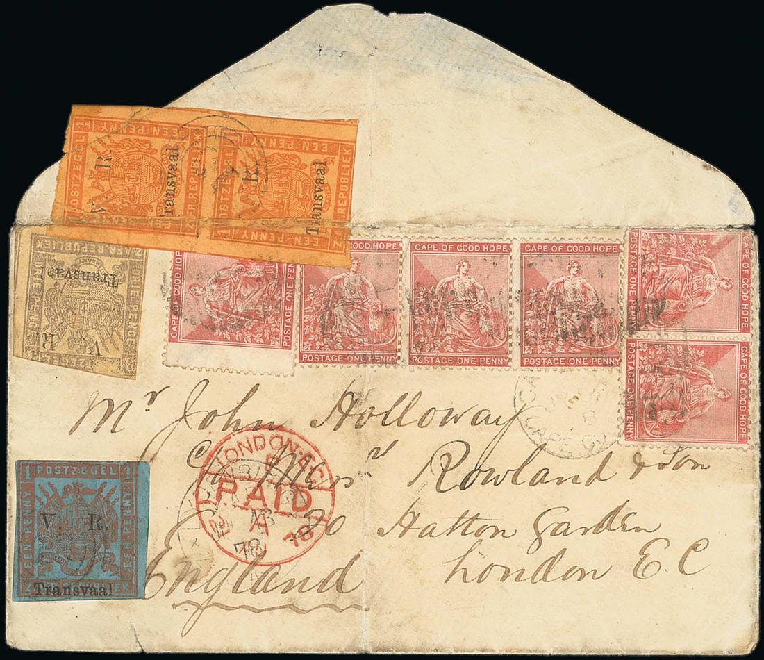 1878 (13 June) envelope from Lydenburg to London, bearing 1877-79 imperforate 1d. red on blue, 1d. red on orange vertical pair and 3d. mauve on buff, both 1d. values cancelled "13", in combination with Cape of Good Hope 1d. red (6) all cancelled "1" in oval of bars, despatch datestamp at foot over-cancelled with arrival datestamp (21.8); the envelope with some faults and the 1d. red on orange pair heavily creased through being affixed partially on reverse, nevertheless a rare and colourful franking. B.P.A. Certificate (1956). Photo