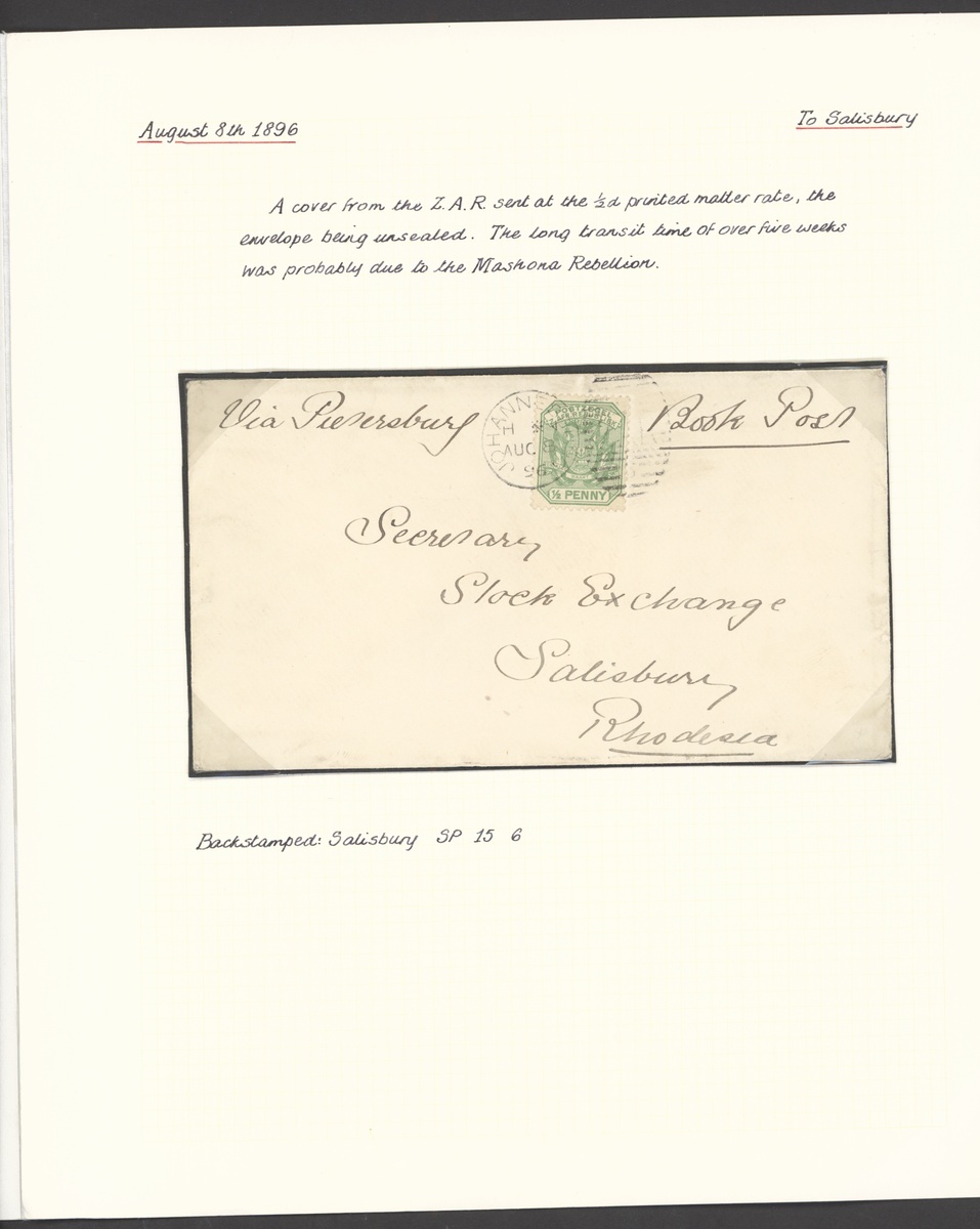 1896 (8 Aug.) unsealed "Book Post" envelope from Johannesburg "Via Petersburg" to Salisbury, Rhodesia, bearing ½d. green cancelled by duplex, arrival datestamp five weeks later (15.9) probably due to the Mashona Rebellion