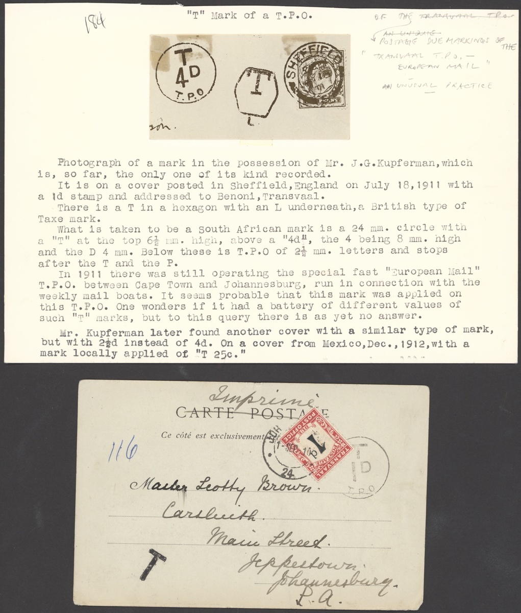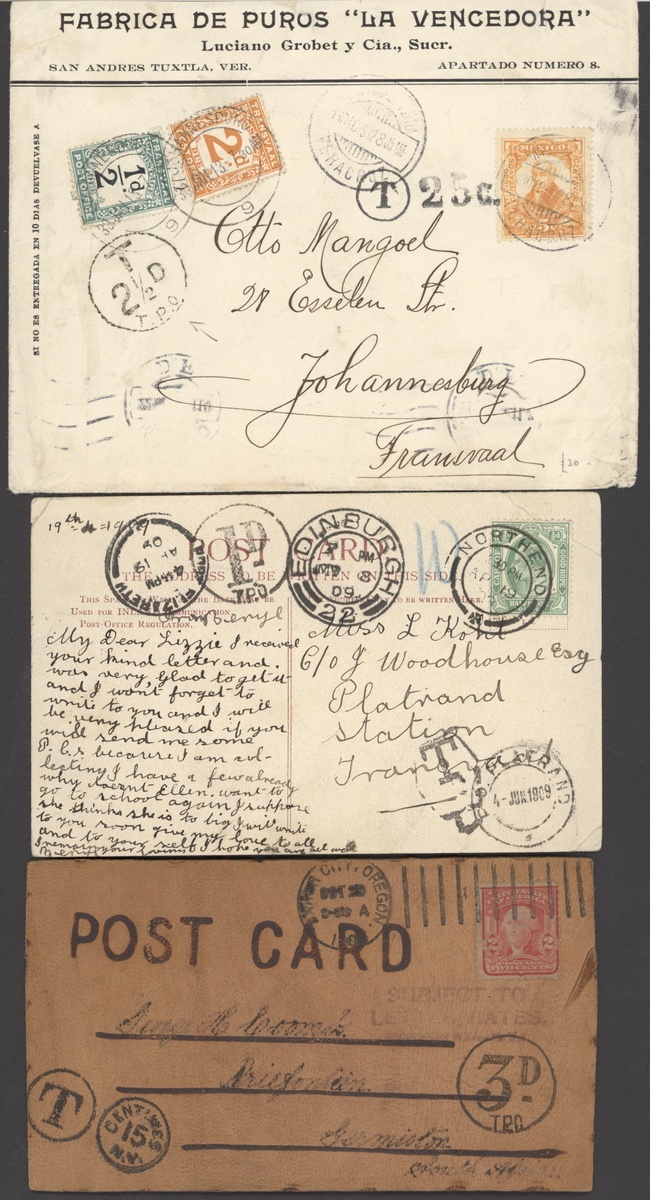 1903-13 selection of cards (8, one a leather type) and an envelope, largely incoming, one bearing Postage Due ½d. and four with 1d., four with circular-framed "