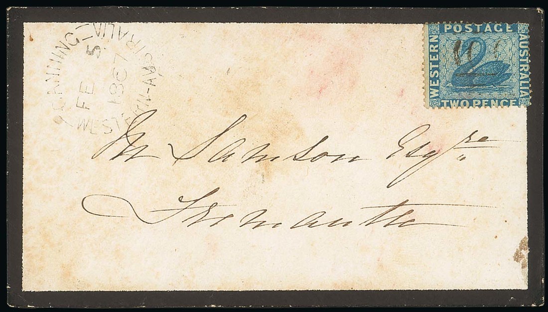 1867 (5 Feb.) mourning envelope from Canning to Fremantle, bearing 1861 clean-cut perf 14-16 2d.blue, indistinctly cancelled, showing light