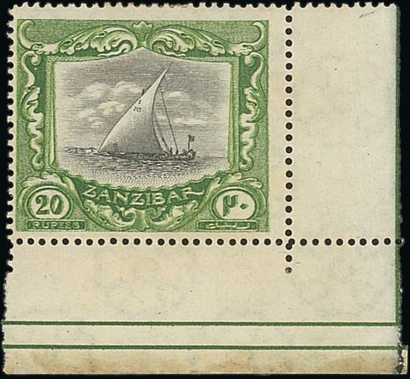 1913 20r. black and green lower right corner example, variety frame doubly printed, fresh with large part original gum. Very rare and most attractive. B.P.A. Certificate (2003). S.G. 260b var. Photo