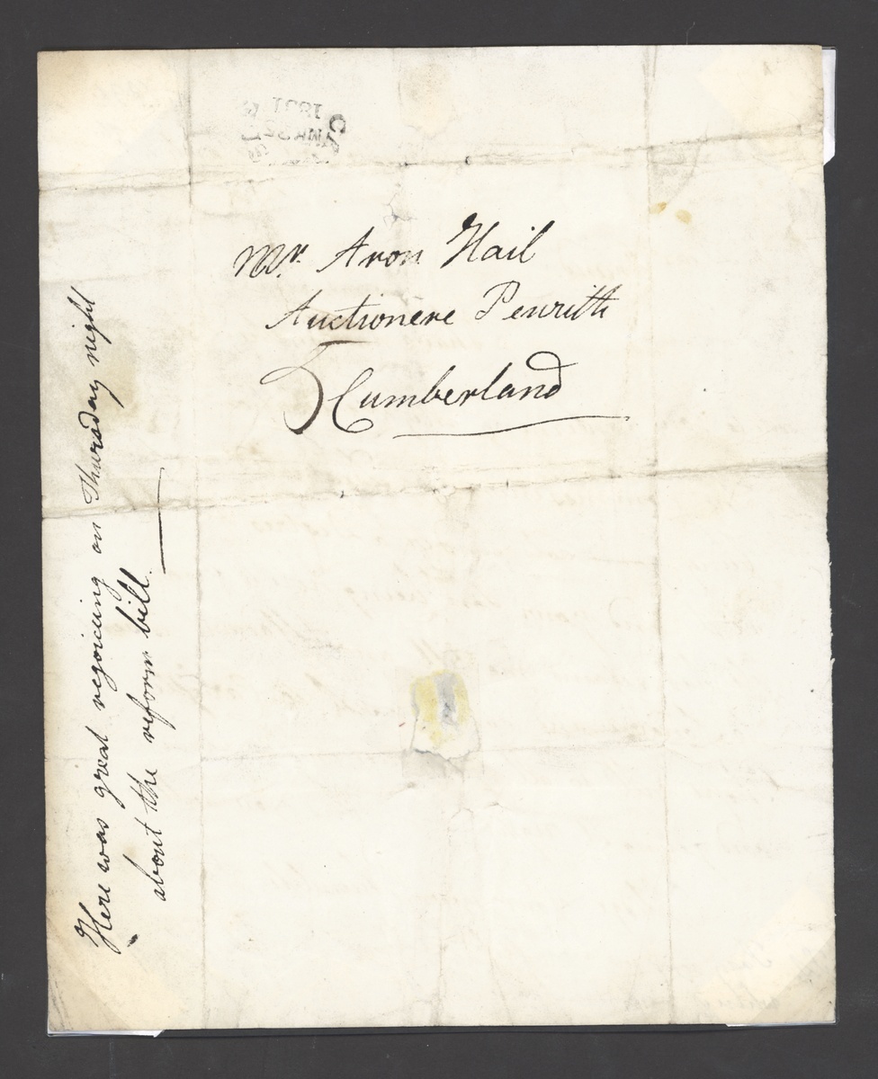 1831 (25 March) entire letter to Penrith, written from Carlisle Jail, sent to an "Auctionere" (sic) who is selling the prisoner's goods to pay for rent arrears; poor Carlisle datestamp with mileage removed on the reverse; crumpled and some slight staining but most unusual