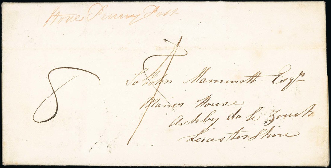 1838 (11 May) entire letter to Ashby de la Zouch with manuscript red "Stone Penny Post" on the front, on reverse (across flap)