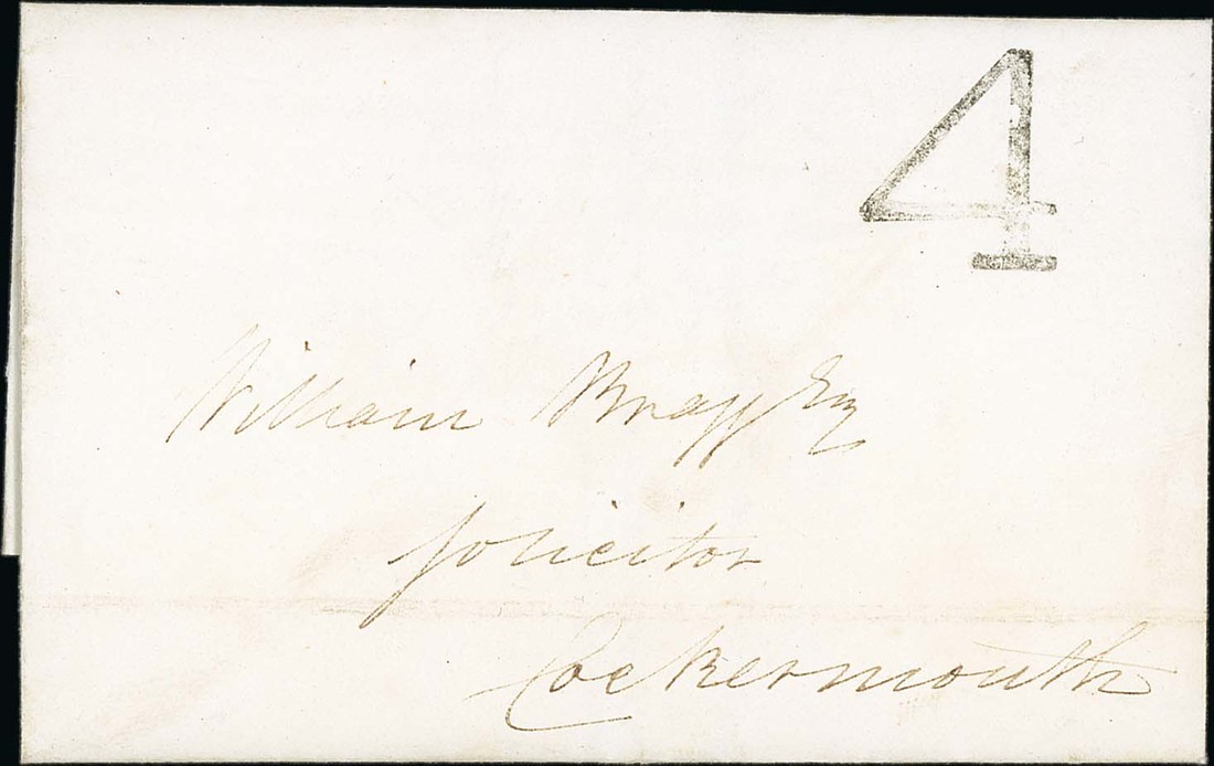 1839 (25 Dec.) entire letter to Cockermouth with superb and upright Carlisle "4" handstamp, on reverse Carlisle c.d.s., extremely rare and of exhibition quality. Photo