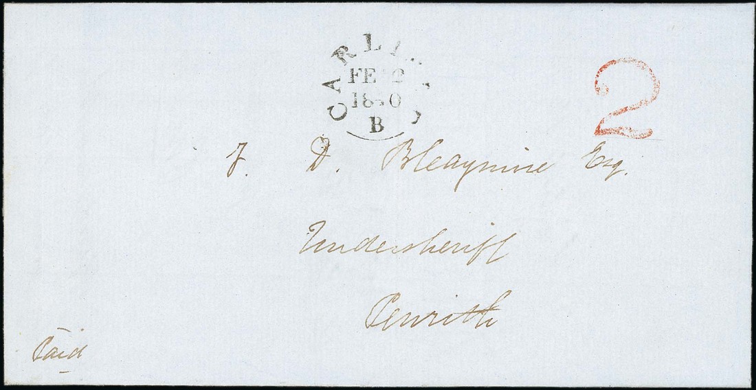 1840 (12 Feb.), entire letter to Penrith with very fine red Carlisle "2" handstamp with Carlisle c.d.s. alongside, endorsed "Paid" at lower left; fine and scarce. Photo