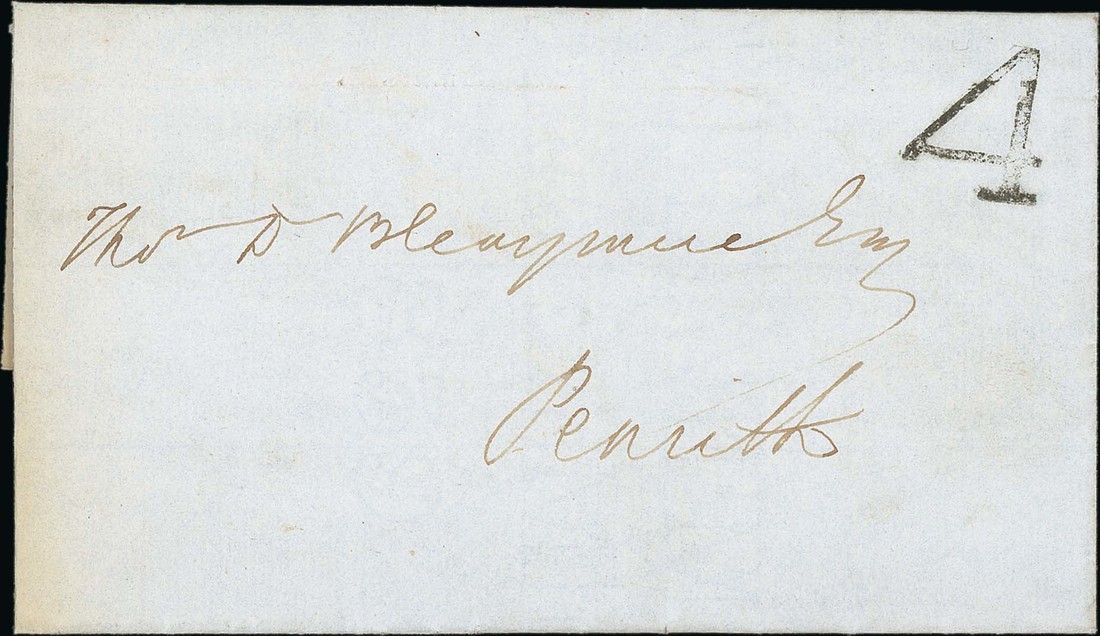 1840 (Feb. 5) entire letter to Penrith with a superb Carlisle handstruck "4", Carlisle c.d.s. on reverse; light filing fold through the marking; very fine appearance and rare. Photo