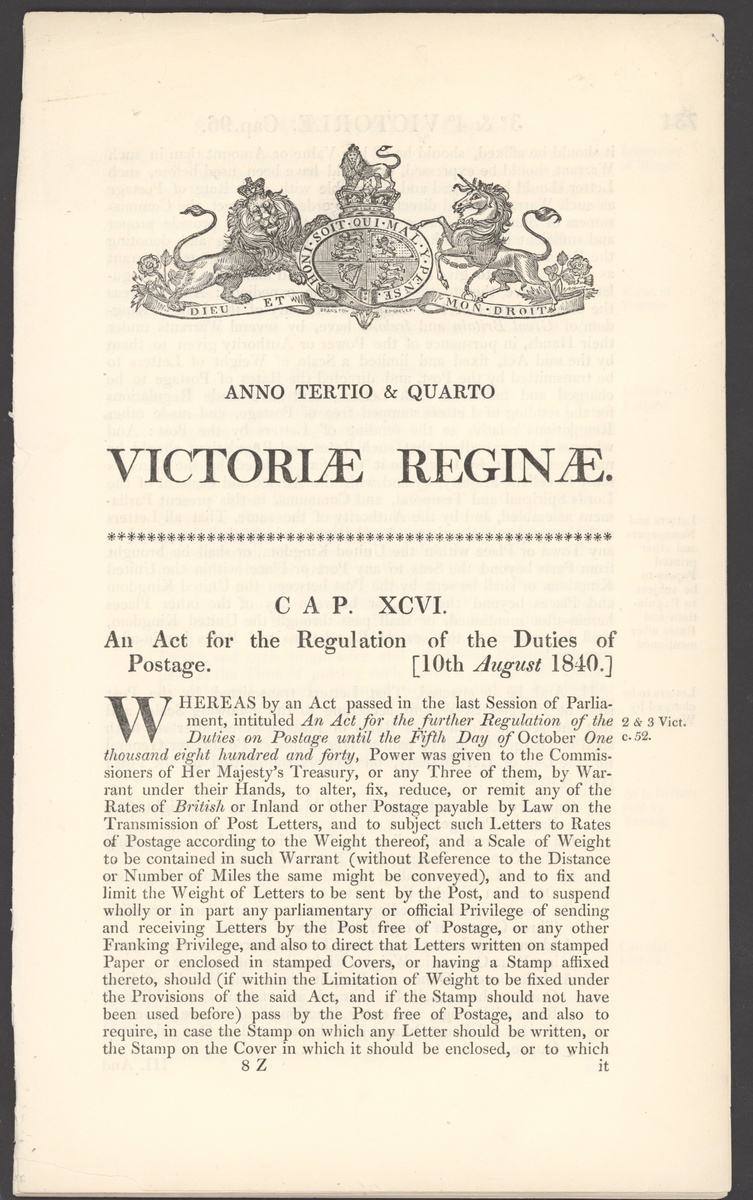 1840 (10 Aug.) "An act for the Regulation of the duties of Postage", includes letters by weight/by vessels/inland letters/rates/ship letters/stamped covers, etc., fine and an important act