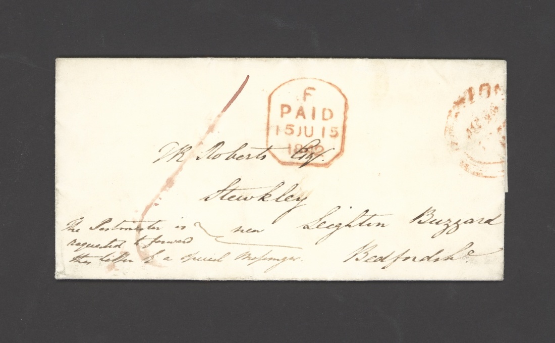 1842 (14 June) entire letter from Bristol to Stewkley with red Tombstone Paid datestamp and endorsement The Postmaster is requested to forward this letter by a special messenger, with interesting contents including "We will be at .... 25 Threadneedle Street London at two o'clock on that day. If we are a few minutes late it will be owing to some hinderance in the mail train from hence"