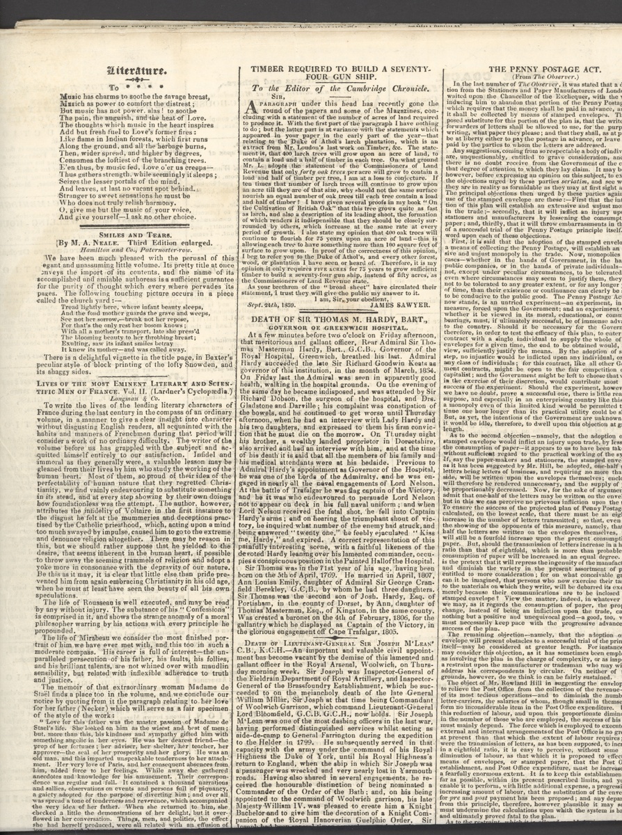 1849 (28 Sept.) "Cambridge Chronicle & Journal", with an insertion on the back page concerning the forthcoming introduction of the Penny Post on 10 January 1840. There were objections from the stationers and paper manufacturers of London regarding the requirement that money shall be paid in advance by means of pre-stamped envelopes; fine and important