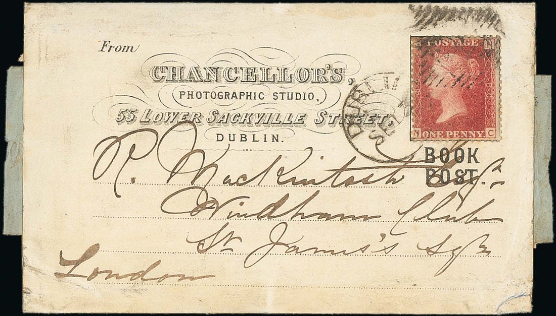 1865 (ca.) printed "Chancellor's Photographic Studio" wrapper to London, franked 1d. Plate 80 with Dublin duplex cancellation; some soiling on the reverse and crumpled corners. Attractive and rare. Photo