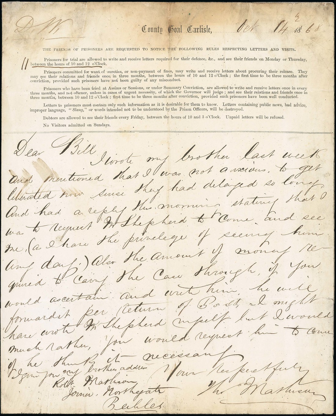 1868 (Oct. 14) entire letter (Printed County Goal Carlisle, Rules letter sheet) to Penrith, franked 1d. Plate 104 with Carlisle "165" duplex cancellation; fine and most unusual. The prison rules being a fascinating insight into the times, including ".... may see their relations and friends once in three months" and "Letters containing public news, bad advice, improper language, "slang", or words intended not to be understood by the prison officers, will be destroyed". Photo