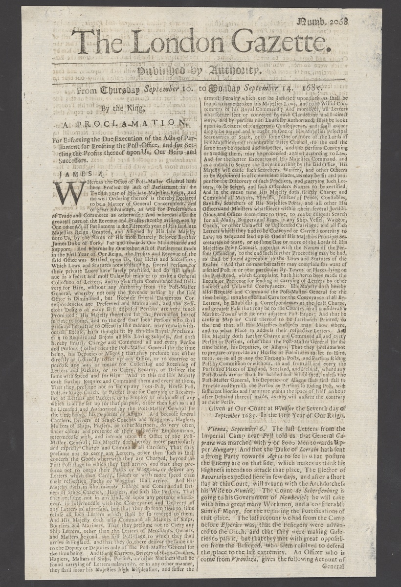 1685 (10-14 Sept.), announcement "By the King, a proclamation, for enforcing the due execution of the acts of Parliament for erecting the Post Office and settling the profits thereof upon us, our Heirs and Successors....." 1¾ columns; some slight stains but fine for its age. Rare and highly important