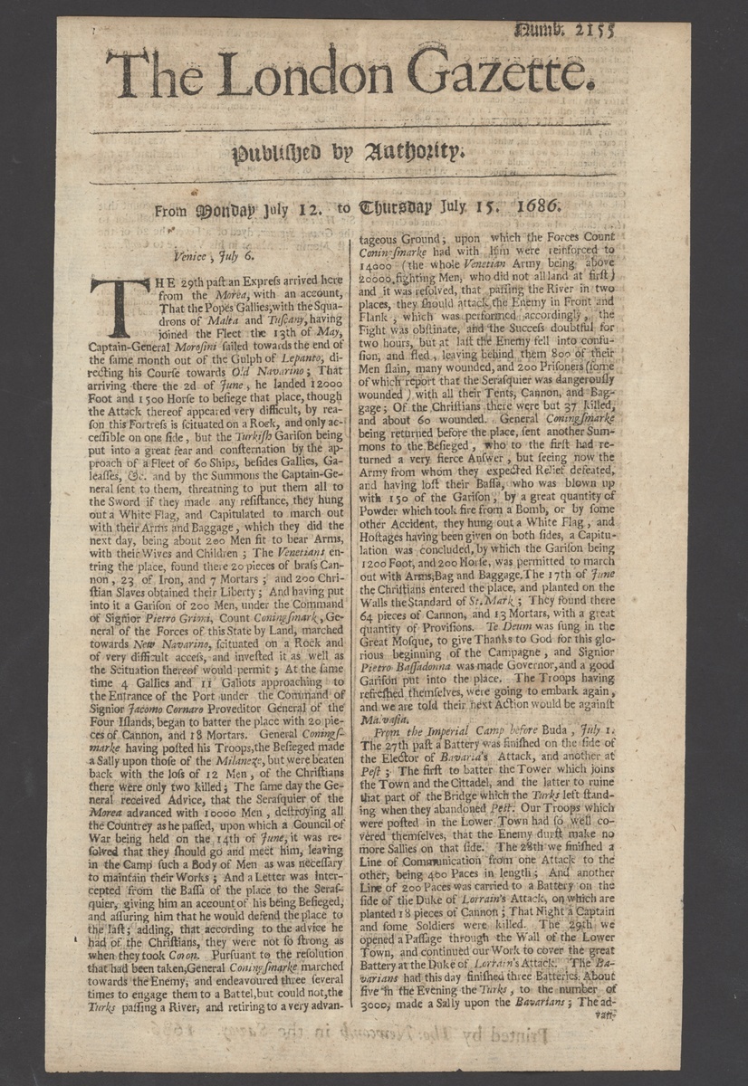 1686 (12-15 July) "The London Gazette" with announcement "Westminster, June 10, This last trinity term judgement was obtained in his Majesties court of King's Bench, against John Warren, carrier of Stanford on Lincolnshire for 440 L. for carrying and conveying of letters and pacquets contrary to law", and details of another case; a little toned but fine for its age. A grave threat from the Government Post Office during the Dockwra period