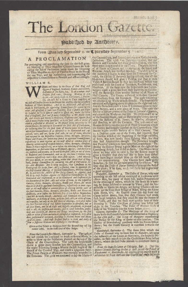 1689 (2-5 Sept.) "The London Gazette" with reports of two mail robberies, the first by three men on horseback, who led the paquet horse by the bridle and the Post Boy, out of the highway to an adjacent by-lane where they stole "The Scotch Mail" and "My Lord Newill's black box", the second robbery involved three people, who "set upon the Chester mail about a mile beyond Highgate taking the Paquet-Horse and Paquet into an adjacent wood......." and much more, concluding with "whoever gives notice of the said robbers to the General Letter Office at London shall be very well rewarded". Fine for its age and rare
