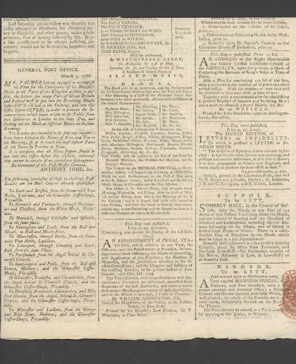 1786 (22-25 April) "The Whitehall Evening Post" with General Post Office notice listing the 19 Mail coaches already established, two years after Palmer's first mail coach; fine and important