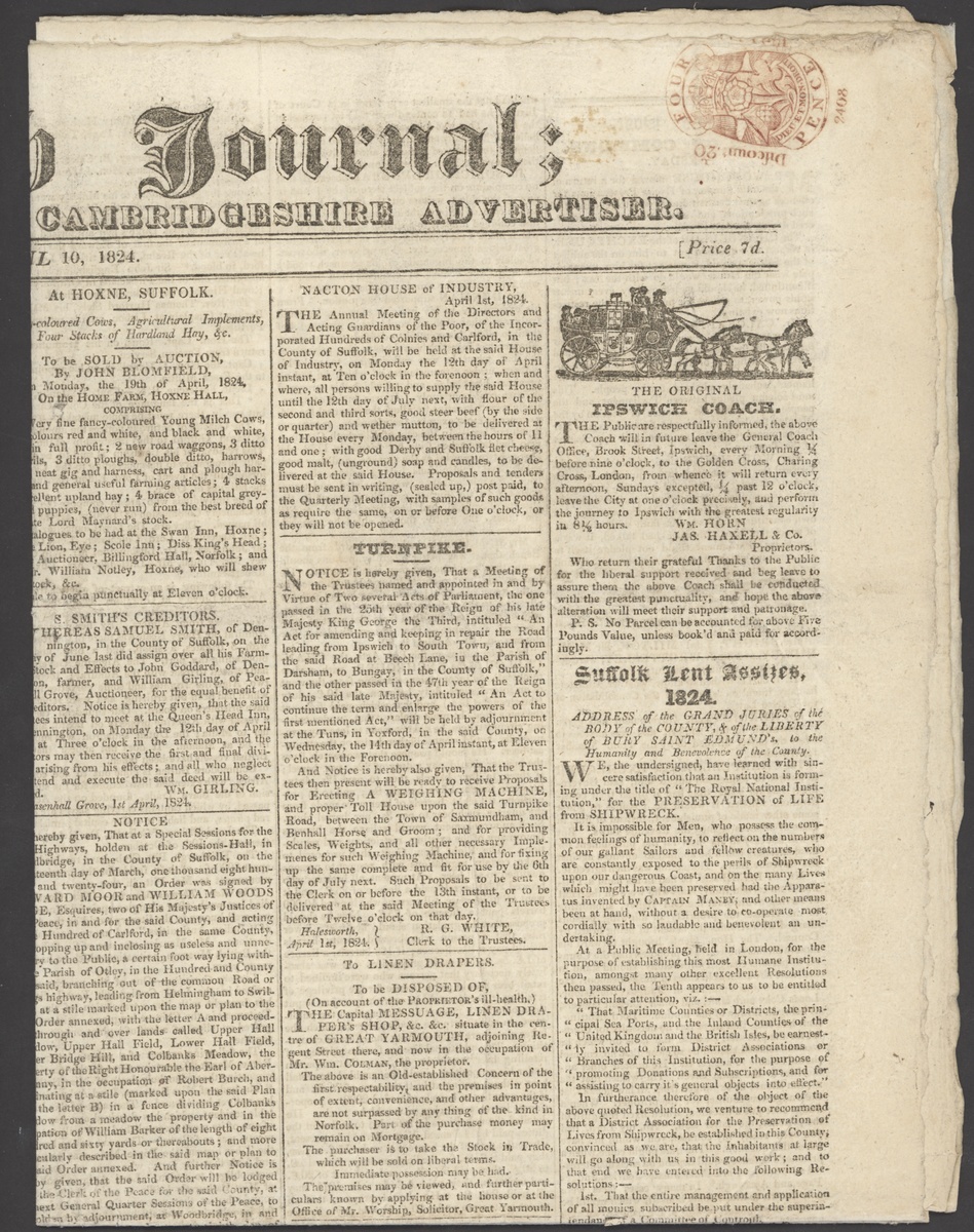 1787 (6 Dec.) "The Bath Chronicle" with advertisements for six Post Coaches (including "A Balloon Coach to London, with a guard all the way, every afternoon a four o'clock)", 1824 (10 April) "The Ipswich Journal" with The original Ipswich Post" with illustration, full details of the service offered and an interesting footnote "P.S. No parcel can be accounted for above five pounds value, unless book'd and paid for accordingly"; both with red Tax stamps (½d. and 4d.)