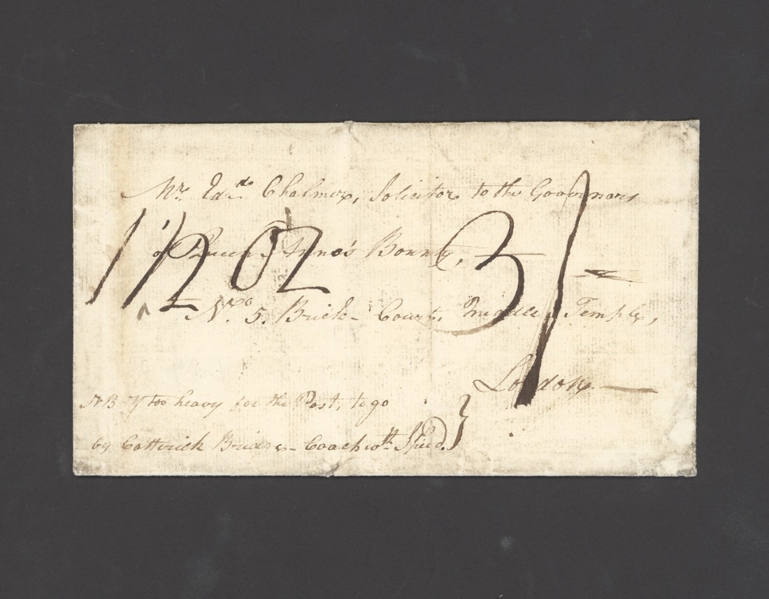 1790 (19 April) entire to London, endorsed "N.B. If too heavy for the Post, to go by Catterick Bridge Coach with Speed" and "1½oz 3/-", on reverse
