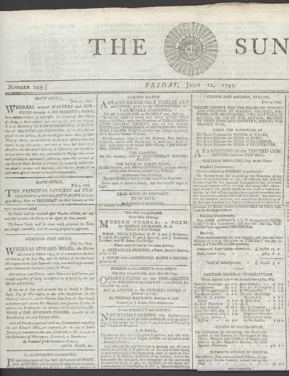 1793 (12 July) "The Sun" with "General Post Office - July 11 1793 - Whereas Edward Miles, the person advertised on October 1791 to be concerned with the horrid murder of the Post Boy, and the robbery of the mail near Warrington on the 15th. September 1791 was lately apprehended, and is committed to Lancaster Castle for trial' and whereas some persons, whose names are well known, are strongly suspected of being Accomplices in, or privvy to, the said murder and robbery; If any of them will surrender him or herself .....such person will receive His Majesty's most gracious pardon, be admitted as evidence for the Crown, and be entitled to a reward of