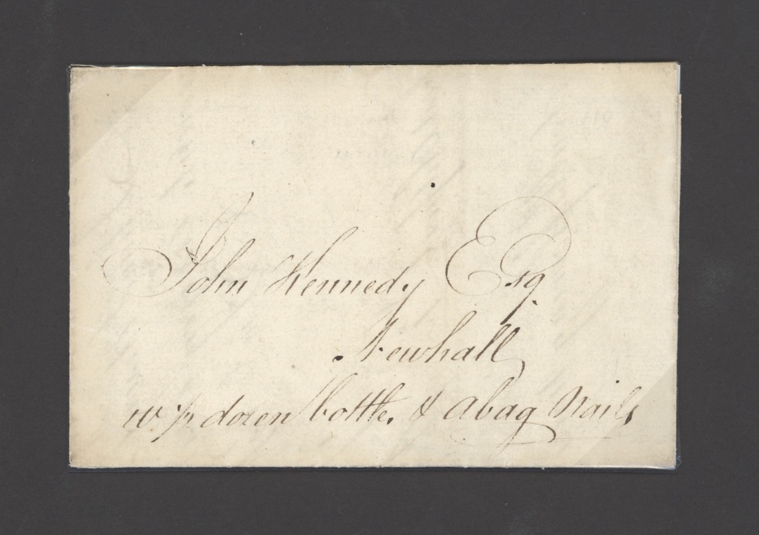 1804 (2 Feb.) entire letter from Perth to Newhall, without postal markings and carried by a common carrier, endorsed "w ½ dozen bottles and a bag of nails" (In 1711 the Post Office Act defined certain exceptions to the Post Office monopoly to carry letters, one exception being the carriage free of charge, by a common carrier of a letter relating to goods being carried on that journey)