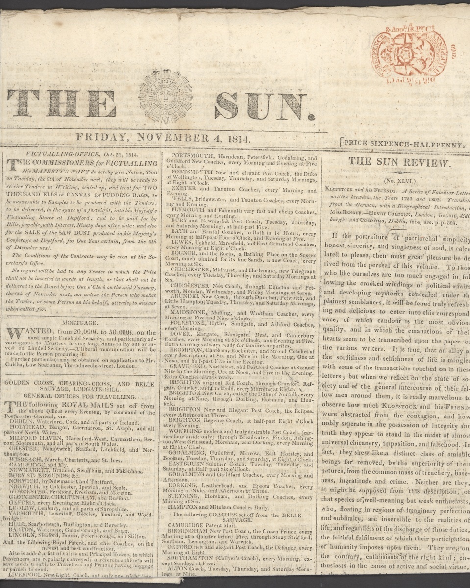 1814 (4 Nov.) "The Sun" with "Golden Cross, Charing-Cross, and Belle Sauvage, Ludgate Hill. General Post Offices for Travelling. The following ROYAL MAILS set of from the above Offices every evening by command of the Postmaster General, vic." followed by a long list of coaches and routes, red 3½d. Tax stamp; some staining but rare and important