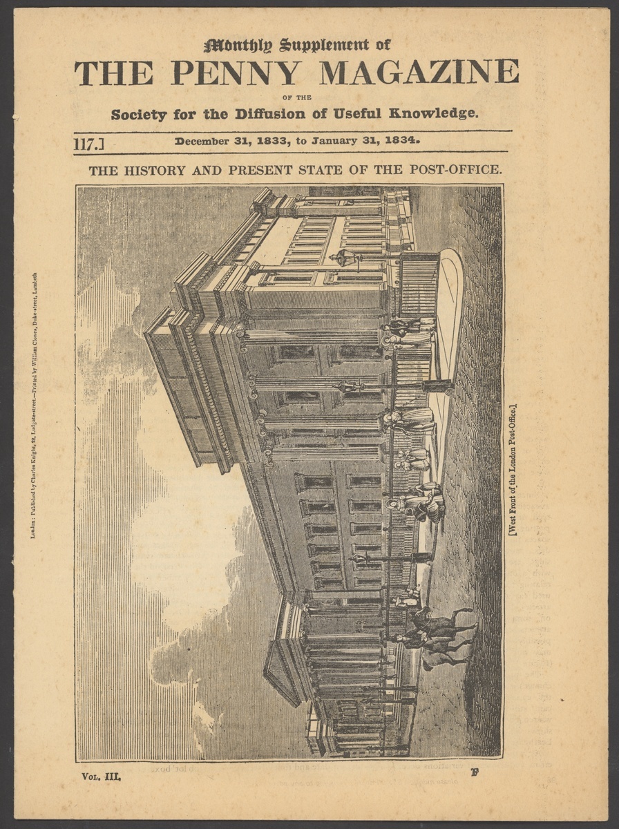 1833 (31 Dec.-31 Jan. 1834) "Monthly Supplement of the Penny Magazine" "The History and Present State of the Post Office", a lengthy (6 page) and highly illuminating article with three engravings, offering an extremely useful insight; very rare