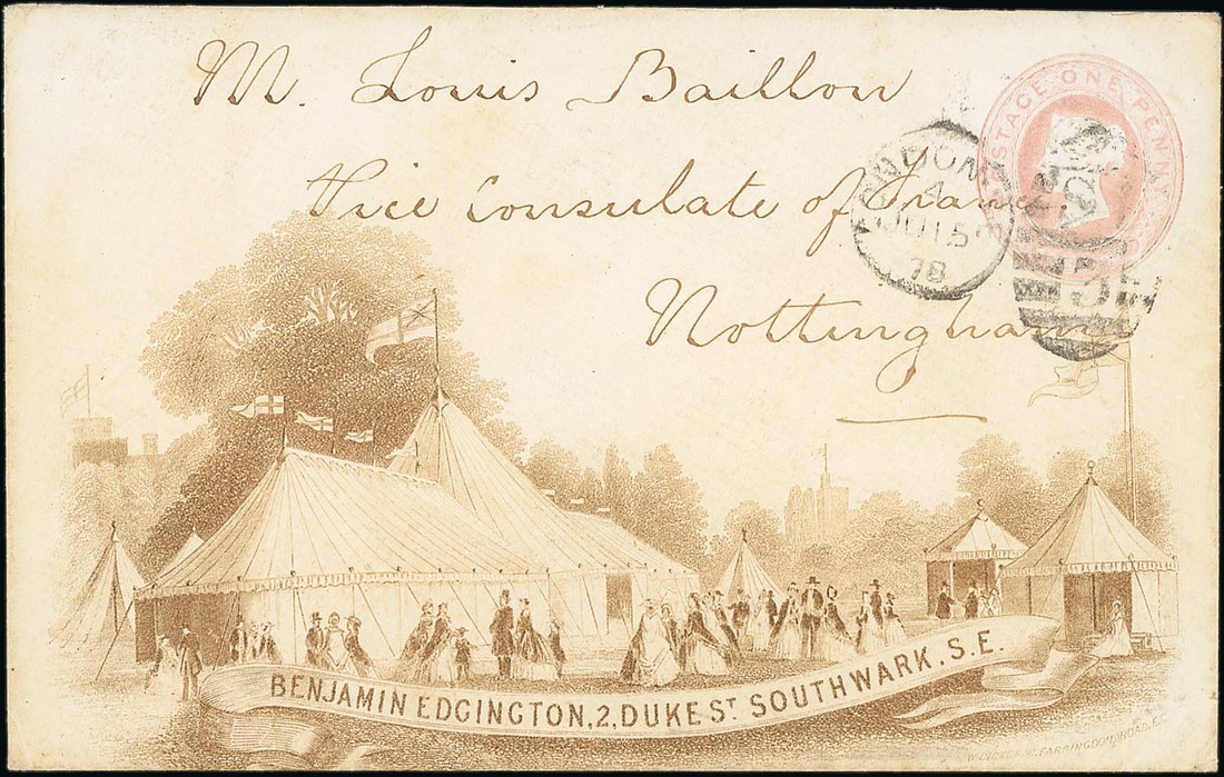 1878 (15 July) Benjamin Edgington "Tents" 1d. pink printed postal stationery envelope to Nottingham, London duplex cancellation, arrival on reverse. Superb and an exhibition quality cover. Photo